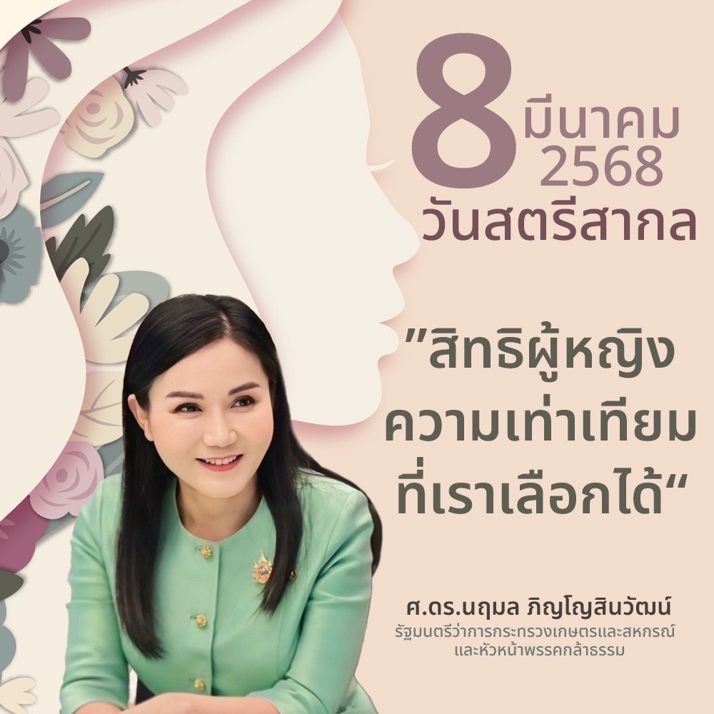 ศ.ดร.นฤมล ภิญโญสินวัฒน์ รัฐมนตรีว่าการกระทรวงเกษตรและสหกรณ์ กล่าวว่า ด้วยวันที่ 8 มีนาคม ของทุกปี ถูกกำหนดให้เป็นวันสตรีสากล (International Women’s Day) เพื่อระลึกถึงการต่อสู้เรียกร้องสิทธิของผู้หญิง ทั่วโลกจึงร่วมเฉลิมฉลองบทบาทและสิทธิของสตรีในการทำงาน สังคม เศรษฐกิจ และการเมือง จึงขอเป็นกำลังใจให้ผู้หญิงไทยในทุกบทบาท ทุกสถานะ ซึ่งเชื่อว่าพลังของผู้หญิงสามารถสร้างความเปลี่ยนแปลงที่สำคัญในหลาย ๆ ด้านได้ ทั้งการเมือง เศรษฐกิจ รวมถึงการศึกษา และปัจจุบันจำนวนสัดส่วนของผู้หญิงในแต่สายงานก็มีจำนวนเพิ่มขึ้น วันนี้จึงเป็นโอกาสที่ดีในการยกย่องความสำคัญของผู้หญิง
