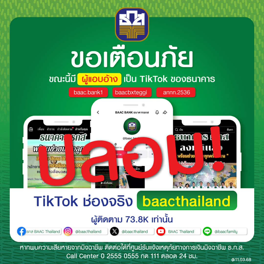 ธ.ก.ส. แจ้งเตือนระวังมิจฉาชีพแอบอ้างชื่อ ตราสัญลักษณ์ธนาคารเป็นชื่อบัญชีบน TikTok และใช้ภาพผู้บริหาร ธ.ก.ส. โดยใช้คำให้หลงเชื่อ อาทิ ธนาคาร ธ.ก.ส. ลงมติแล้ว “พร้อมช่วยเหลือทุกครัวเรือน” ไม่เช็คเครดิตบูโร แบล็คลิสต์ พร้อมช่วยเหลือลูกหนี้ ปิดบ้าน ปิดรถ ปิดหนี้นอกระบบ ครัวเรือนละ 300,000 บาท ยืนยัน ! ธ.ก.ส. ใช้บัญชี TikTok ชื่อ baacthailand เท่านั้น โดยไม่มีส่วนเกี่ยวข้องกับการกระทำหลอกลวงดังกล่าวและไม่มีนโยบายให้สินเชื่อผ่านสื่อสังคมออนไลน์ พร้อมเตรียมดำเนินการแจ้งความเอาผิดผู้หลอกลวง ต่อไป