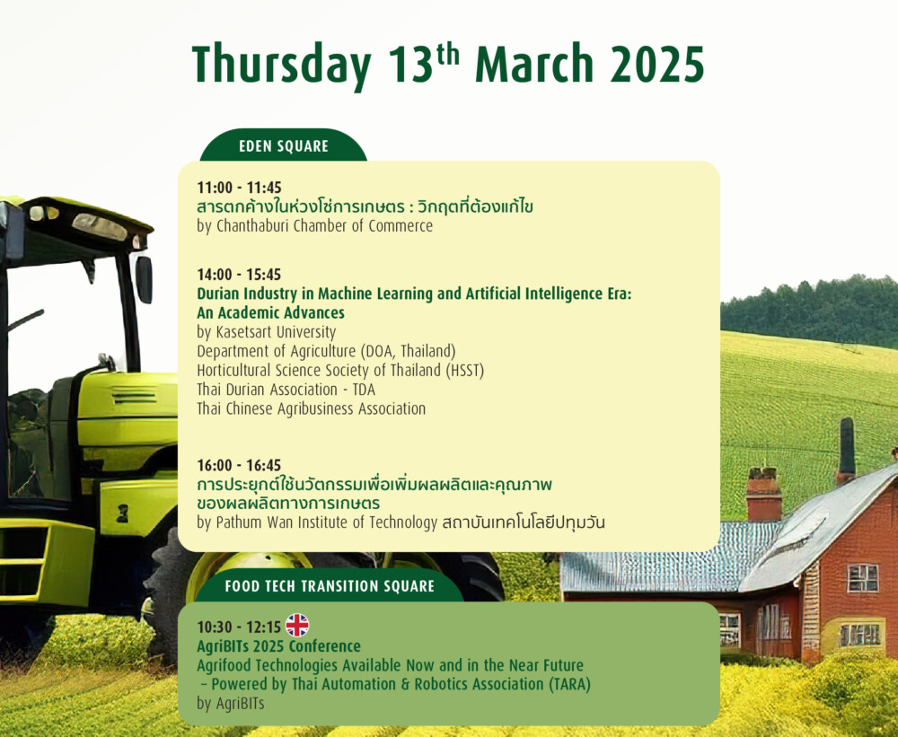 ผู้เยี่ยมชมมีโอกาสได้สำรวจความก้าวหน้าล่าสุด เชื่อมต่อกับผู้เชี่ยวชาญในอุตสาหกรรม และรับข้อมูลเชิงลึกอันมีค่าจากเซสชันที่กระตุ้นความคิด ตั้งแต่การอภิปรายเกี่ยวกับ แนวทางการทำฟาร์มแบบยั่งยืน ไปจนถึง โซลูชันด้านเทคโนโลยีการเกษตร ใหม่ล่าสุด วันนั้นเต็มไปด้วยการแบ่งปันความรู้และการสร้างเครือข่าย