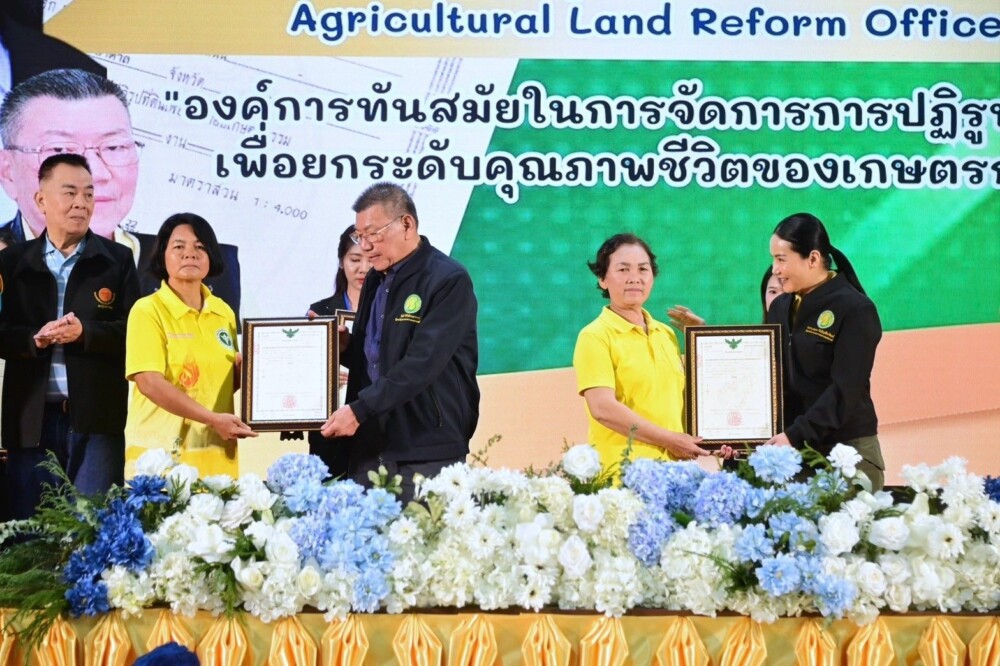ในโอกาสนี้ ศ.ดร.นฤมล และคณะผู้บริหาร ได้มอบโฉนดเพื่อการเกษตร เงินสนับสนุน และปัจจัยการผลิต อาทิ เมล็ดพันธุ์ข้าว พันธุ์สัตว์น้ำ พันธุ์มันสำปะหลังปลอดโรค ตลอดจนเครื่องจักรกลทางการเกษตร ให้แก่ผู้แทนเกษตร เพื่อการต่อยอดอาชีพเกษตรกรในอนาคตต่อไป