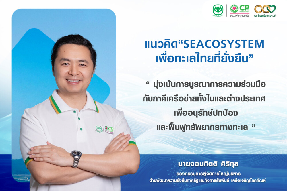 นายจอมกิตติ ศิริกุล รองกรรมการผู้จัดการใหญ่บริหาร ด้านพัฒนาความยั่งยืนภาครัฐ และกิจการสัมพันธ์ เครือเจริญโภคภัณฑ์ (ซีพี) กล่าวถึงแนวทางนโยบายการอนุรั กษ์ ปกป้อง และฟื้นฟูทรัพยากรทางทะเลผ่าน แนวคิด“SEACOSYSTEM เพื่อทะเลไทยที่ยั่งยืน” มุ่งเน้นการบูรณาการ ความร่วมมือกับภาคีเครือข่ายทั้ งในและต่างประเทศ เพื่ออนุรักษ์ปกป้องและฟื้นฟู ทรัพยากรทางทะเล