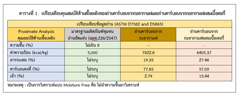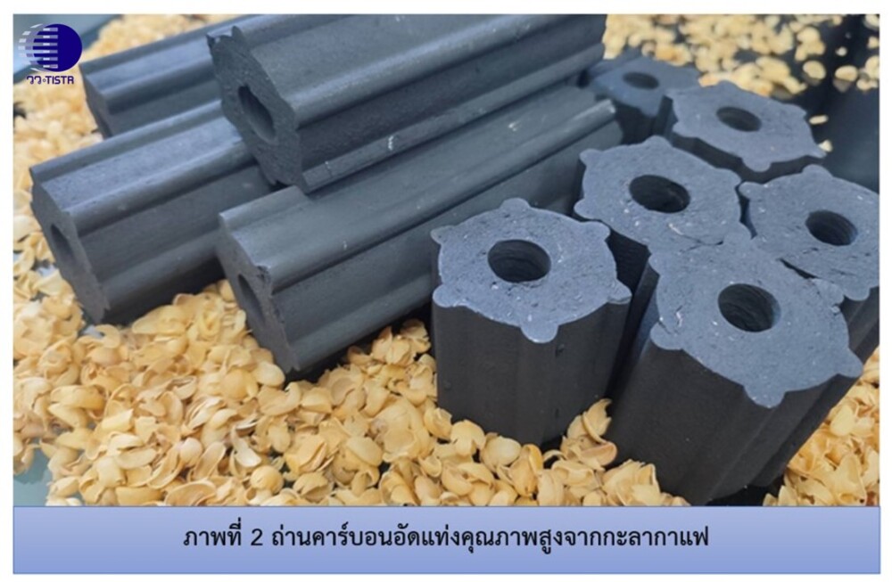“ศูนย์เชี่ยวชาญนวัตกรรมหุ่นยนต์และเครื่องจักรกลอัตโนมัติ (ศนย.) สถาบันวิจัยวิทยาศาสตร์และเทคโนโลยีแห่งประเทศไทย (วว.) จึงได้วิจัยและพัฒนา “เทคโนโลยีผลิตถ่านคาร์บอนจากของเหลือทิ้งกาแฟ” เพื่อนำของเหลือทิ้งมาใช้ประโยชน์ แทนที่จะปล่อยให้เป็นภาระต่อสิ่งแวดล้อมและชุมชน โดยเฉพาะกะลากาแฟซึ่งมีคุณสมบัติที่เหมาะสมในการแปรรูปเป็นถ่านคาร์บอน มีคุณสมบัติ ให้ความร้อนสูง ติดไฟง่าย เผาไหม้ได้นาน ไม่แตกประทุและไม่มีควัน”