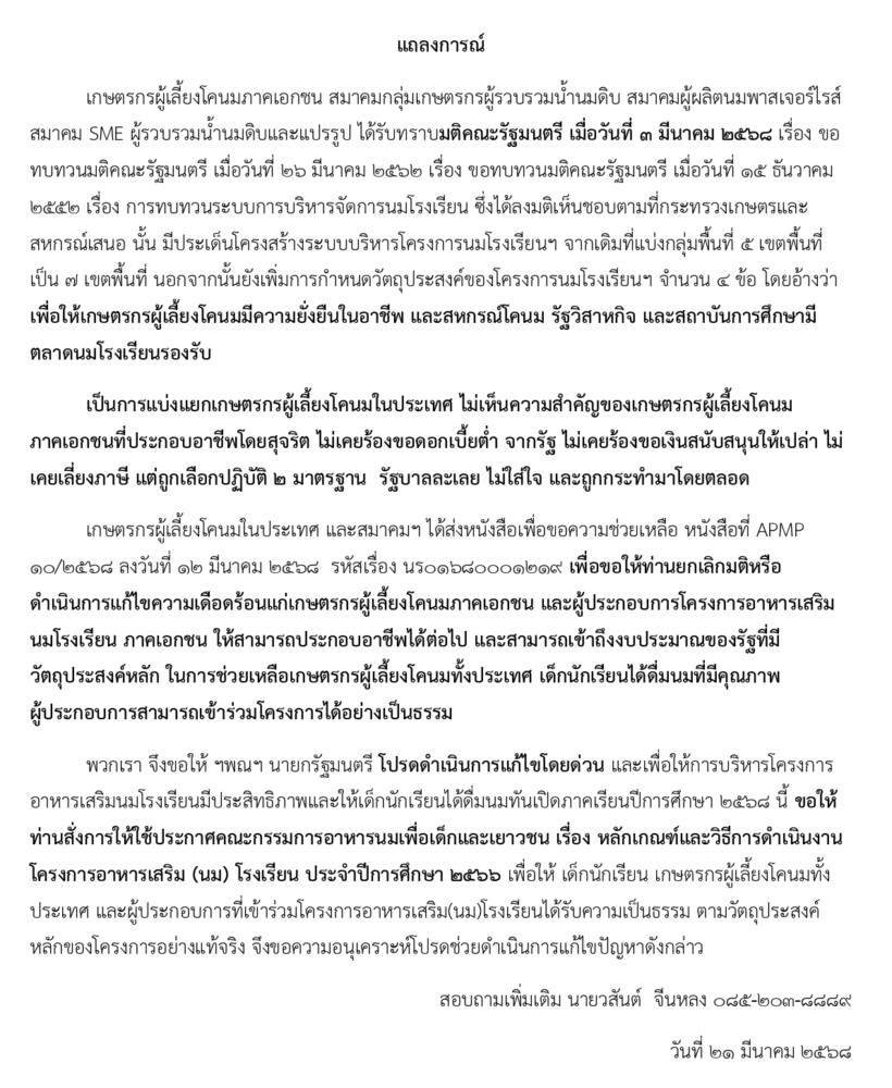 แถลงการณ์ ระบุว่า กลุ่มเกษตรกรผู้เลี้ยงโคนมภาคเอกชน สมาคมกลุ่มเกษตรกรผู้รวบรวมน้ำนมดิบ สมาคมผู้ผลิตนมพาสเจอร์ไรส์สมาคม SME ผู้รวบรวมน้ำนมดิบและแปรรูป ได้รับทราบมติคณะรัฐมนตรี เมื่อวันที่ ๓ มีนาคม ๒๕๖๘ เรื่อง ขอทบทวนมติคณะรัฐมนตรี เมื่อวันที่ ๒๖ มีนาคม ๒๕๖ เรื่อง ขอทบทวนมติคณะรัฐมนตรี เมื่อวันที่ ๑๕ ธันวาคม๒๕๕๒ เรื่อง การทบทวนระบบการบริหารจัดการนมโรงเรียน ซึ่งได้ลงมติเห็นชอบตามที่กระทรวงเกษตรและสหกรณ์เสนอ นั้น มีประเด็นโครงสร้างระบบบริหารโครงการนมโรงเรียนฯ จากเดิมที่แบ่งกลุ่มพื้นที่ ๕ เขตพื้นทีเป็น ๗ เขตพื้นที่ นอกจากนั้นยังเพิ่มการกำหนดวัตถุประสงค์ของโครงการนมโรงเรียนฯ จำนวน ๔ ข้อ โดยอ้างว่าเพื่อให้เกษตรกรผู้เลี้ยงโคนมมีความยั่งยืนในอาชีพ และสหกรณ์โคนม รัฐวิสาหกิจ และสถาบันการศึกษามีตลาดนมโรงเรียนรองรับ