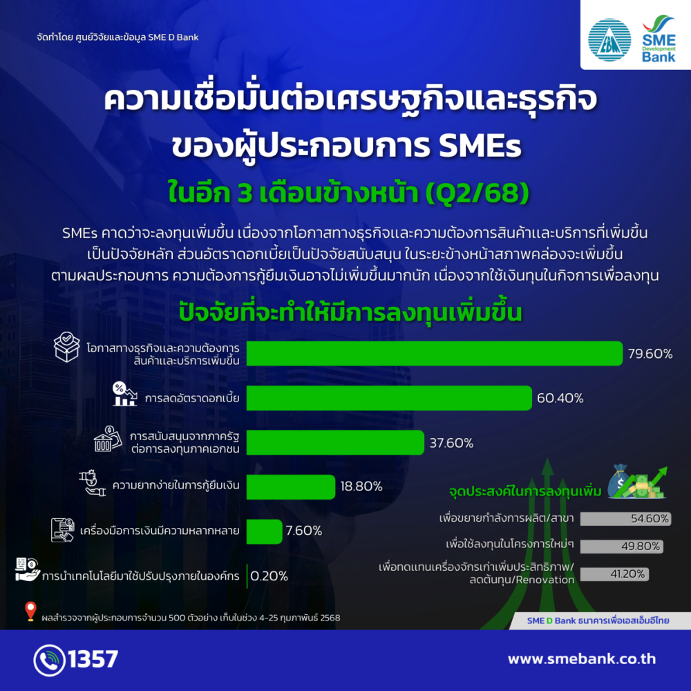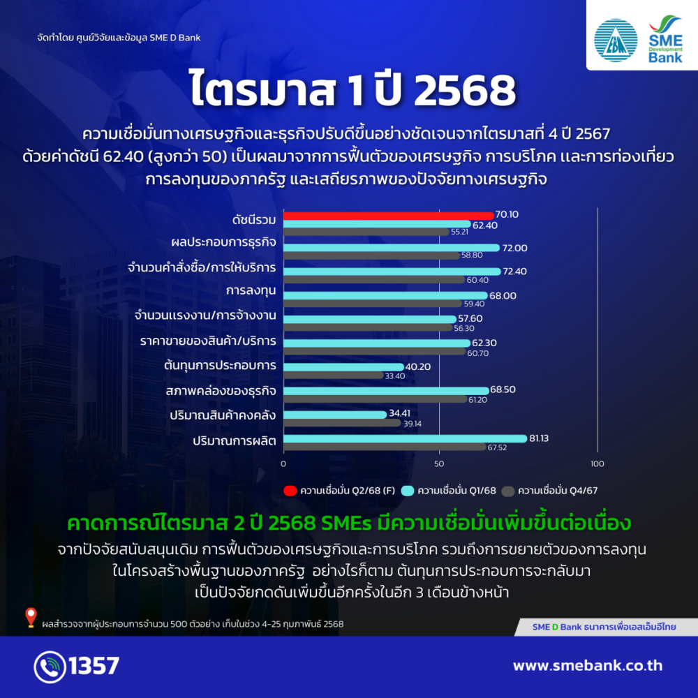 นายพิชิต มิทราวงศ์ กรรมการผู้จัดการ ธนาคารพัฒนาวิสาหกิจขนาดกลางและขนาดย่อมแห่งประเทศไทย (ธพว.) หรือ SME D Bankกล่าวว่า SME D Bank โดย “ศูนย์วิจัยและข้อมูล ธพว.” ร่วมกับสำนักวิจัยเศรษฐกิจและประเมินผล บริษัท เอ็กเซลเลนท์ บิสเนส แมเนจเม้นท์ จำกัด ทำการสำรวจ “ดัชนีความเชื่อมั่นของผู้ประกอบการ SMEs ต่อเศรษฐกิจและธุรกิจ ไตรมาส 1/2568 และคาดการณ์อนาคต” จากกลุ่มผู้ประกอบการเอสเอ็มอีทั่วประเทศ ครอบคลุมทุกประเภทอุตสาหกรรม จำนวน 500 ตัวอย่าง พบว่า ไตรมาส 1 ปี 2568 ความเชื่อมั่นต่อเศรษฐกิจและการทำธุรกิจปรับตัวดีขึ้นอย่างชัดเจน โดยดัชนีรวมเพิ่มขึ้น จาก 55.21 ในไตรมาสที่แล้ว (Q4/67) เป็น 62.40 โดยเฉพาะด้านผลประกอบการ เนื่องจากมีคำสั่งซื้อและการลงทุนที่เพิ่มขึ้นอย่างชัดเจน อย่างไรก็ตาม เรื่องต้นทุนการประกอบธุรกิจยังคงเป็นปัจจัยกดดัน ขณะที่ปัจจัยหลักที่ช่วยเพิ่มความเชื่อมั่น ได้แก่ การฟื้นตัวของเศรษฐกิจ การบริโภคและการท่องเที่ยว การลงทุนภาครัฐ และเสถียรภาพของปัจจัยทางเศรษฐกิจ