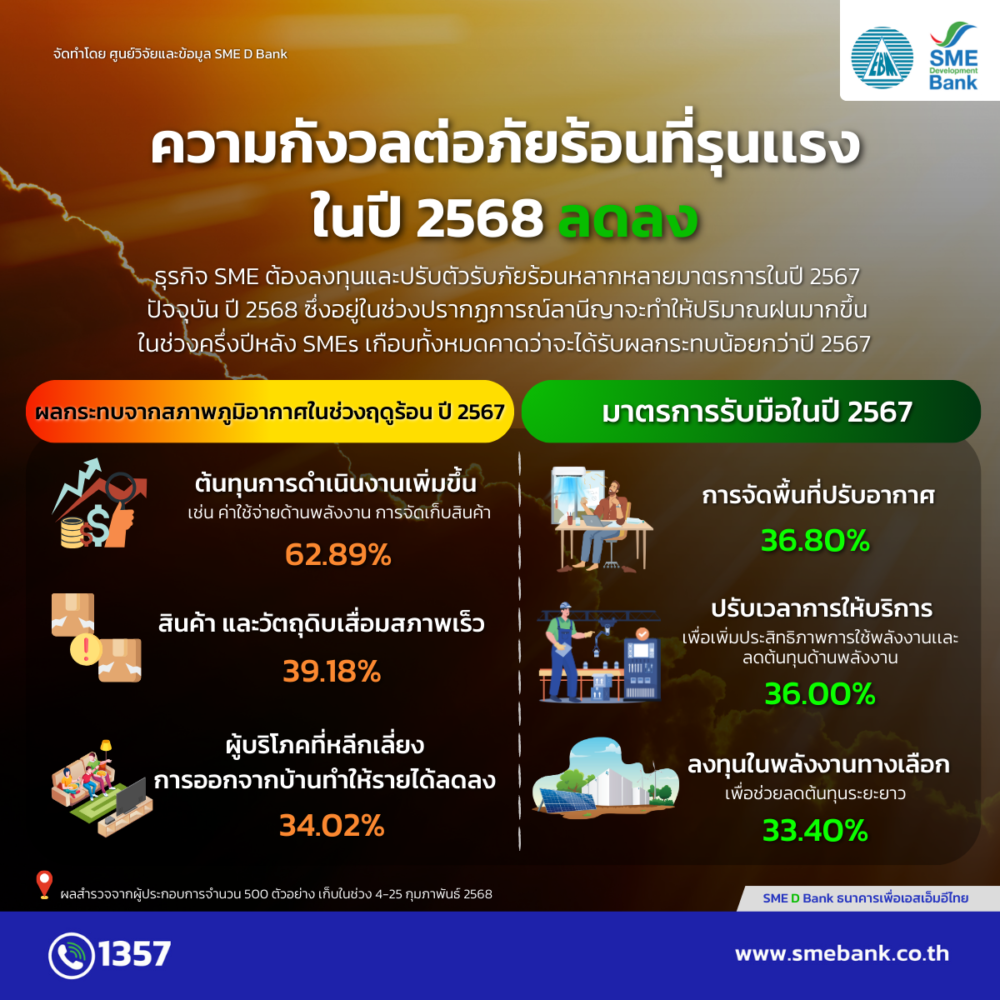 แม้ไตรมาส 2 เริ่มเข้าสู่ช่วงฤดูร้อน แต่ปัจจุบัน ปี 2568 อยู่ในช่วงปรากฏการณ์ลานีญา ทำให้มีปริมาณฝนมากขึ้นในช่วงครึ่งปีหลัง ทำให้ผู้ประกอบการ SMEs เกือบทั้งหมด จึงคาดว่า ได้รับผลกระทบน้อยกว่าปี 2567 ที่ผ่านมา และไม่ได้รับผลกระทบจากภัยร้อนที่รุนแรง อย่างไรก็ตาม ในปีที่ 2567 ที่ผ่านมา ผู้ประกอบการ SME ต้องลงทุนและปรับตัวรับภัยร้อนหลากหลายมาตรการ แต่ความกังวลลดลงในปี 2568