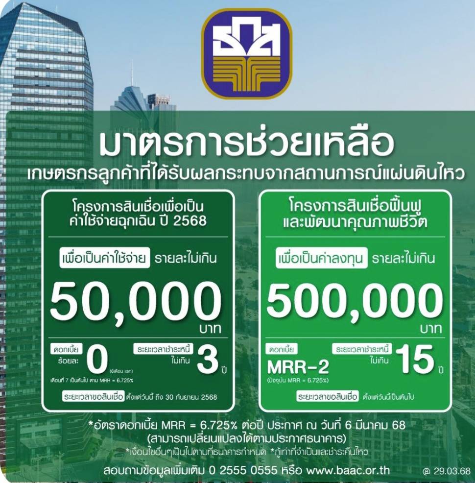 ธ.ก.ส. เร่งช่วยเหลือและบรรเทาความเดือดร้อนเกษตรกรผู้ประสบภัยพิบัติทางธรรมชาติ ผ่านสินเชื่อเพื่อเป็นค่าใช้จ่ายฉุกเฉิน วงเงินรายละไม่เกิน 50,000 บาท อัตราดอกเบี้ย 0% 6 เดือนแรก และโครงการสินเชื่อฟื้นฟูและพัฒนาคุณภาพชีวิต วงเงินรายละไม่เกิน 500,000 บาท อัตราดอกเบี้ย MRR ลบ 2 % ต่อปี วงเงินรวม 20,000 ล้านบาท แจ้งได้ตั้งแต่วันนี้เป็นต้นไป จนถึง 30 ก.ย. 68