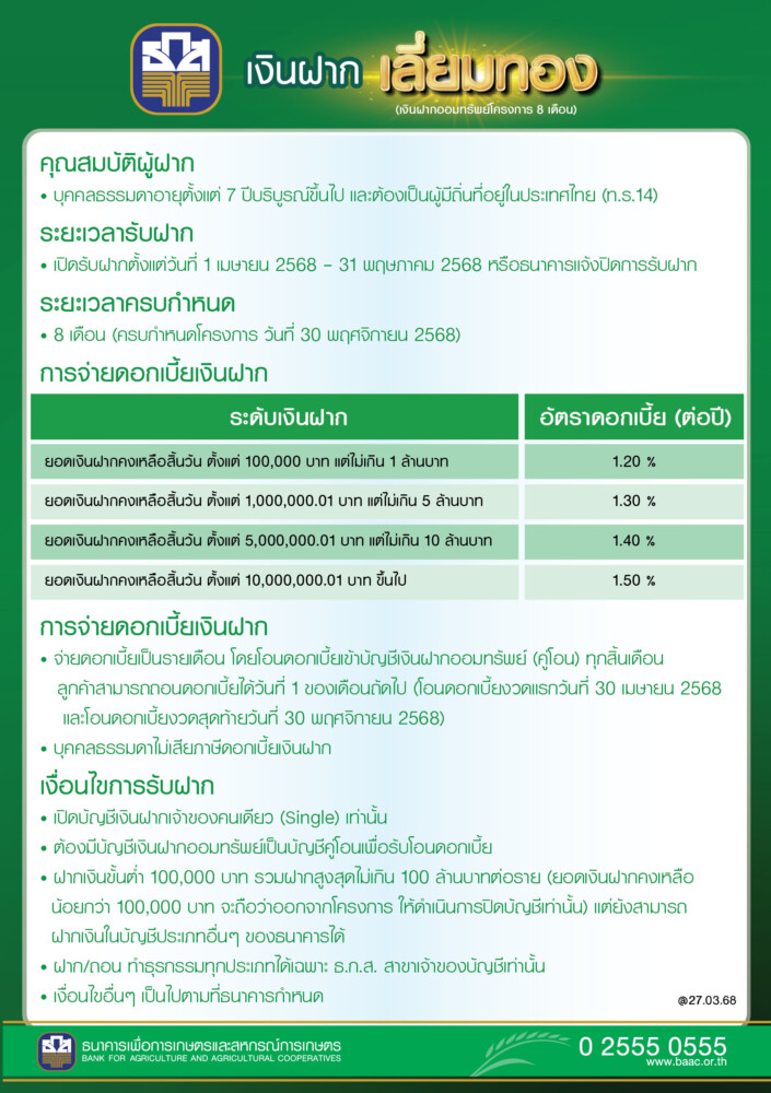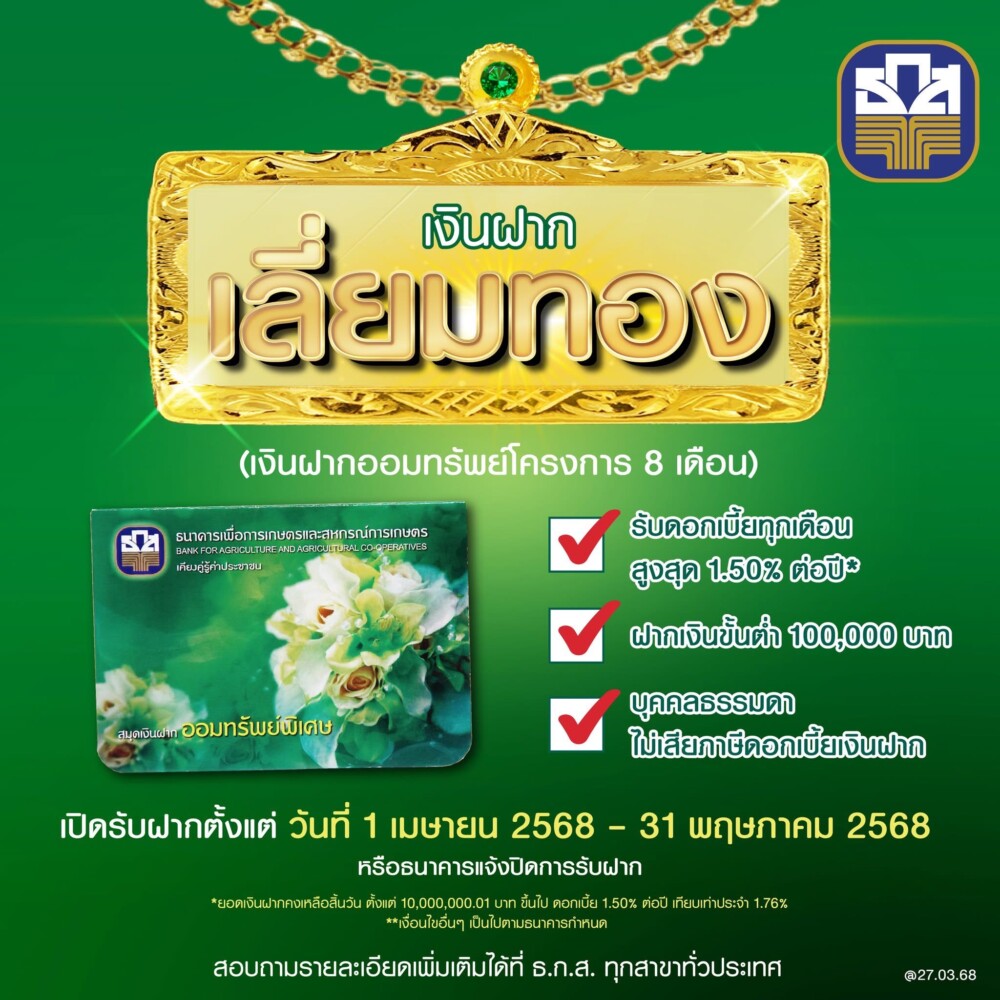 ธ.ก.ส. เปิดตัว “เงินฝากเลี่ยมทอง” เงินฝากออมทรัพย์ที่ให้ผลตอบแทนแน่นอน รับดอกเบี้ยทุกวันสิ้นเดือน ตามยอดเงินฝากคงเหลือสิ้นวัน สูงสุดถึงร้อยละ 1.50 ต่อปี ถอนดอกเบี้ยไปใช้จ่ายได้ทันทีทุกวันที่ 1 ของเดือนถัดไป ฝากเงินขั้นต่ำครั้งละ 100,000 บาท สูงสุดไม่เกิน 100 ล้านบาท/ราย ระยะเวลาฝาก 8 เดือน เปิดรับฝากตั้งแต่วันที่ 1 เมษายน – 31 พฤษภาคม 2568 ที่ ธ.ก.ส. ทุกสาขาทั่วประเทศ