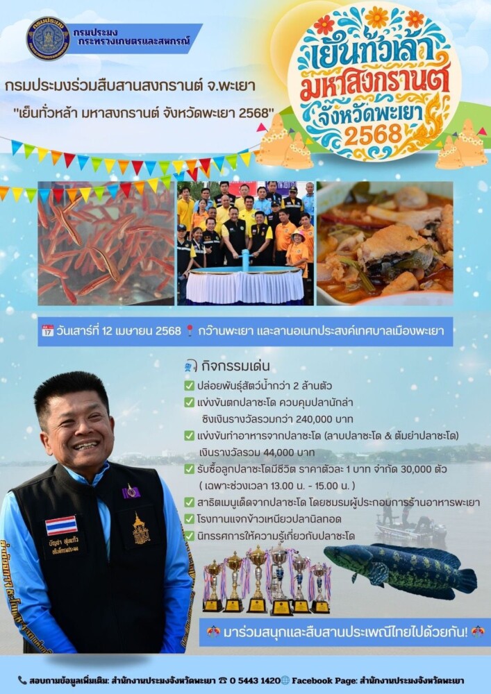 กรมประมง…ร่วมสืบสานประเพณีไทย จัดงานใหญ่ “เย็นทั่วหล้า มหาสงกรานต์ จังหวัดพะเยา” ประจำปี 2568 เพื่อร่วมสืบสานประเพณีสงกรานต์ไทย ในวันเสาร์ที่ 12 เมษายน 2568 ณ กว๊านพะเยา พร้อมบรรจุ 4 กิจกรรมน่าสนใจ “ปล่อยพันธุ์สัตว์น้ำกว่า 2 ล้านตัว -แข่งขันตกปลาชะโด ชิงเงินรางวัลรวมกว่า 2.4 แสวนบาท- รับซื้อลูกปลาชะโดที่มีชีวิตจากกว๊านพะเยา ราคาตัวละ 1 บาท” หวังลดจำนวนปลานักล่า และสร้างความสมดุลระบบนิเวศกว๊านพะเยาสู่แหล่งอาหารชุมชนที่ยั่งยืน