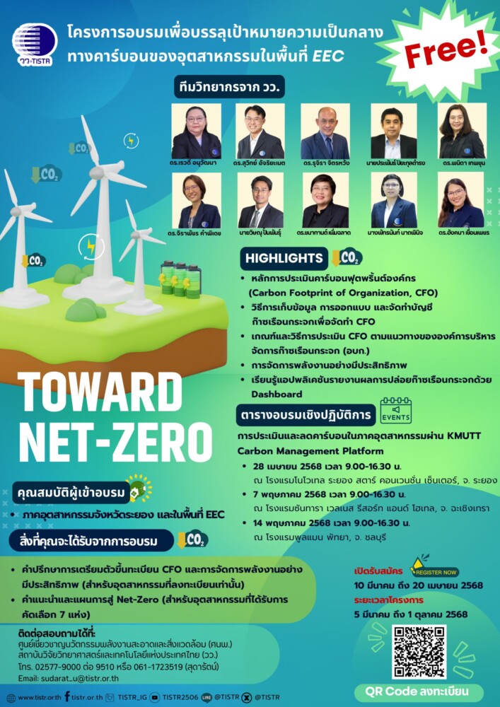 กระทรวงการอุดมศึกษา วิทยาศาสตร์ วิจัยและนวัตกรรม (อว.) โดย สถาบันวิจัยวิทยาศาสตร์และเทคโนโลยีแห่งประเทศไทย (วว.) ขอเชิญผู้สนใจเข้าร่วม “โครงการอบรมเพื่อบรรลุเป้าหมายความเป็นกลางทางคาร์บอนของอุตสาหกรรมในพื้นที่ EEC” ฟรี ! ระหว่างเดือนเมษายน-พฤษภาคม 2568 ณ จังหวัดระยอง ฉะเชิงเทรา และชลบุรี ถ่ายทอดความรู้โดยทีมวิทยากรผู้เชี่ยวชาญจาก วว.