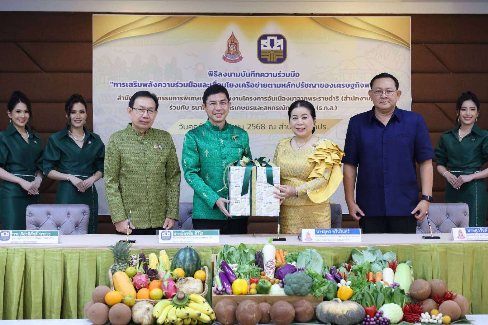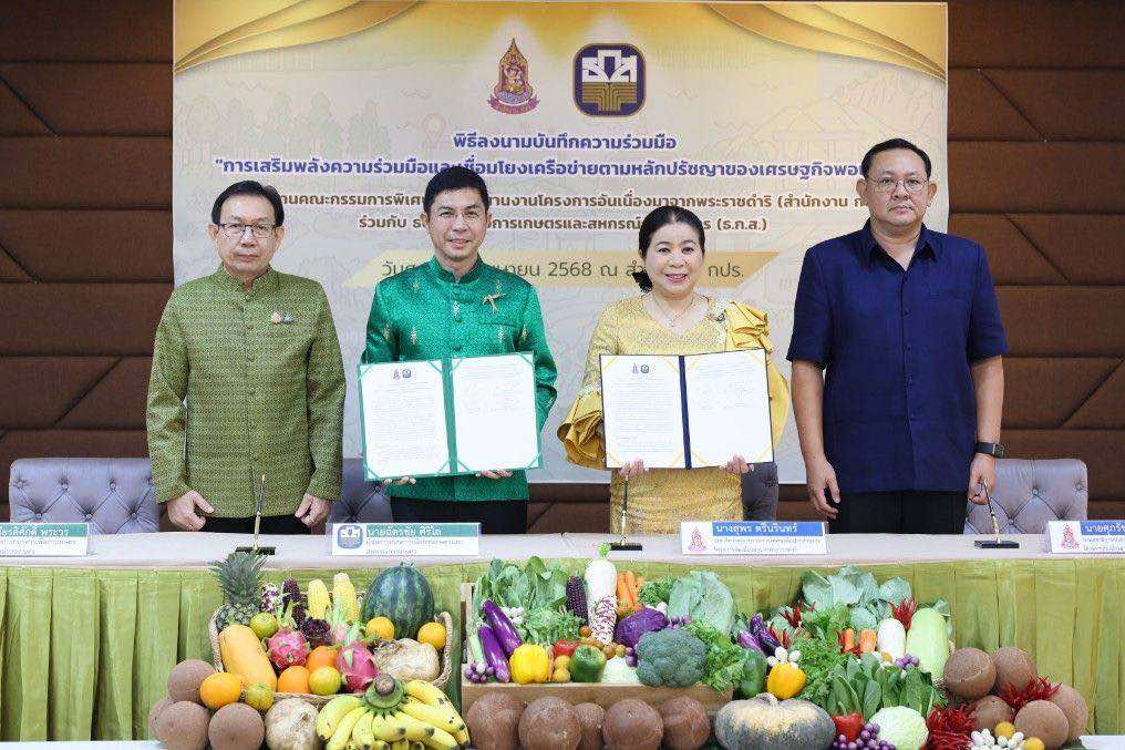 พิธีลงนามจัดขึ้น ณ ห้องประชุม สำนักงาน กปร. ระหว่าง นางสุพร ตรีนรินทร์ เลขาธิการ คณะกรรมการพิเศษเพื่อประสานงานโครงการอันเนื่องมาจากพระราชดำริ และนายฉัตรชัย ศิริไล ผู้จัดการธนาคารเพื่อการเกษตรและสหกรณ์การเกษตร ร่วมลงนามในบันทึกข้อตกลงความร่วมมือ โดยมีคณะผู้บริหารจากทั้งสองหน่วยงานเข้าร่วมเป็นสักขีพยาน ความร่วมมือครั้งนี้มีเป้าหมายเพื่อส่งเสริมและสนับสนุนการดำเนินงานด้านการตลาดของเกษตรกรเครือข่ายของโครงการอันเนื่องมาจากพระราชดำริทั่วประเทศ เชื่อมโยงเครือข่ายชุมชนอุดมสุขสู่ธุรกิจสีเขียว (BCG) โดยเน้นบูรณาการทรัพยากร ความรู้ และเครือข่ายจากทั้งสองหน่วยงาน เพื่อยกระดับคุณภาพชีวิตของเกษตรกรให้สามารถพึ่งพาตนเองได้อย่างยั่งยืน ตามหลักปรัชญาของเศรษฐกิจพอเพียง