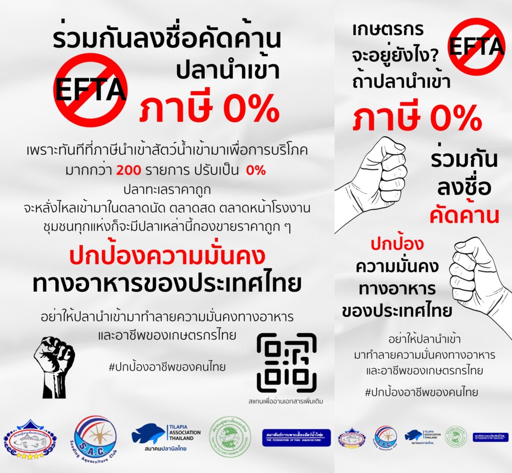 ”เราขอเรียกร้องให้รัฐบาลฟังเสียงประชาชน เกษตรกรผู้เพาะเลี้ยงปลาของประเทศ ที่ส่วนใหญ่เป็นรายย่อย และภาคส่วนที่เกี่ยวข้อง ขอให้ยกรายการสินค้าปลาและผลิตภัณฑ์ทั้งหมดกว่า 100 รายการ ซึ่งเกือบทั้งหมดเป็นปลาที่นอร์เวย์ ไอซ์แลนด์ ประเทศผู้นำโลกด้านการเพาะเลี้ยง-การผลิตอาหารทะเลออกจากการเจรจาฯข้อตกลงการเปิดเสรีการค้านี้ เพราะผลกระทบจากการเปิดเสรี เปิดให้ปลากว่า 100 รายการ เข้ามาในประเทศแบบไม่ต้องเสียภาษีนี้ จะร้ายแรงมาก ต่อความอยู่รอดอย่างยั่งยืนของผู้เพาะเลี้ยงปลาและอุตสาหกรรมของประเทศ ขอให้จัดสินค้าปลาและผลิตภัณฑ์เป็นสินค้าอ่อนไหว เป็นรายการยกเว้นการเจรจา (Exclision List) เช่นเดียวกับ กรณีข้าวของญี่ปุ่น และนมของแคนาดา และคงภาษีที่ร้อยละ 5 และคัดค้านการเปิดเสรี (ภาษีเป็นศูนย์-0%) ในสินค้าเหล่านี้ เพื่อปกป้องอาชีพและความมั่นคงทางอาหารของประเทศ” ประธานสมาพันธ์การเพาะเลี้ยงสัตว์น้ำไทย กล่าว