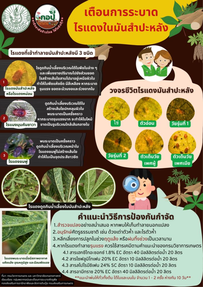 กรมส่งเสริมการเกษรเตือนเกษตรกรผู้ปลูกมันสำปะหลังในทุกภาคของประเทศไทย เฝ้าระวังการระบาดของไรแดงในมันสำปะหลัง ช่วงมีสภาพอากาศแห้งแล้ง อุณหภูมิสูง เอื้อต่อการระบาดของไรแดงในมันสำปะหลังได้ดี โดยไรศัตรูพืชเหล่านี้จะมีลักษณะปากที่แตกต่างจากไรทั่ว ๆ ไป คือ จะมีอวัยวะที่เรียกว่า chelicerae ซึ่งเป็นส่วนประกอบที่สำคัญของปาก มีลักษณะเป็นเข็มแหลม (stylets) เพื่อใช้ทิ่มแทงเข้าไปในเนื้อเยื่อหรือเซลล์ของพืชอาศัย เพื่อดูดกินน้ำเลี้ยง ทำให้เกิดแผลบนผิวของพืชบริเวณนั้น