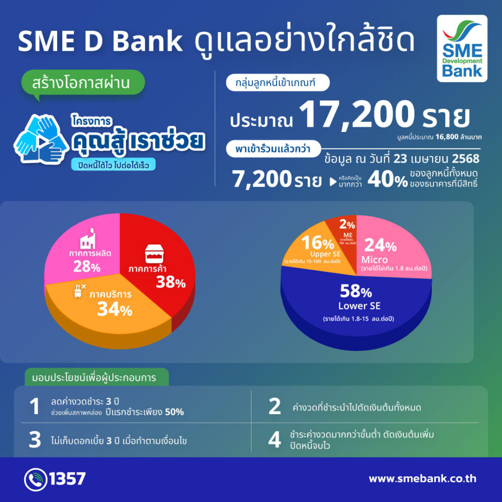 SME D Bank ขับเคลื่อนนโยบายรัฐบาล โครงการ “คุณสู้ เราช่วย” ดูแลกลุ่มเอสเอ็มอีที่มีสิทธิ์กว่า 17,200 ราย อย่างใกล้ชิด พาเข้าร่วมแล้ว ณ วันที่ 23 เม.ย. 68 กว่า 7,200 ราย หรือคิดเป็นกว่า 40% จากลูกหนี้ทั้งหมดที่มีสิทธิ์ ประกาศข่าวดี ขยายระยะเวลาสมัครลงทะเบียนสมัครถึงวันที่ 30 มิ.ย. 68 นี้ เพื่อรับประโยชน์ช่วยลดภาระ สร้างโอกาสกลับมาเริ่มต้นธุรกิจอีกครั้ง