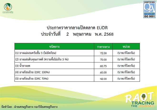 สำหรับราคายางที่ปรับขึ้นต่อเนื่องในขณะนี้เป็นผลมาจากความร่วมมือระหว่างการยางแห่งประเทศไทย (กยท.) และคณะกรรมการเครือข่ายสถาบันเกษตรกรชาวสวนยาง ในการขอความร่วมมือเครือข่ายเกษตรกรชาวสวนยางเลื่อนฤดูกาลเปิดกรีดยางออกไปอีก 1 เดือน จากเดิมที่จะทำการเปิดเดือน พ.ค. 2568 โดยให้เริ่มทำการเปิดกรีดเดือน มิ.ย. 2568 ซึ่งจะทำให้ผลผลิตยางหายไปจากระบบตลาดโลกไม่ต่ำกว่า 3 แสนตัน