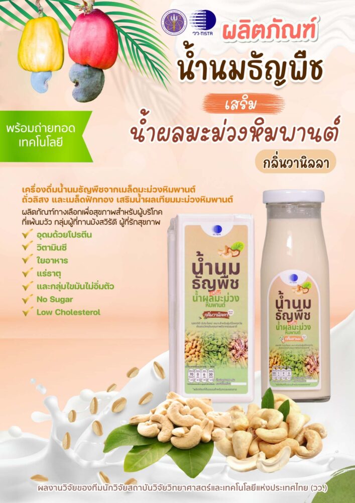 จากคุณประโยชน์หลากหลายดังกล่าว กระทรวงการอุดมศึกษา วิทยาศาสตร์ วิจัยและนวัตกรรม (อว.) โดย สถาบันวิจัยวิทยาศาสตร์และเทคโนโลยีแห่งประเทศไทย (วว.) นำมาเพิ่มมูลค่าด้วยวิทยาศาสตร์ เทคโนโลยีและนวัตกรรม ผ่านการดำเนินโครงการการวิจัยและพัฒนาผลิตภัณฑ์อาหารแปรรูปมูลค่าเพิ่มจากมะม่วงหิมพานต์ (Anacardium occidentale L.) โดยมุ่งเน้นการแปรรูปผลิตผลการเกษตรเพื่อสร้างมูลค่าเพิ่มในรูปผลิตภัณฑ์อาหารและเครื่องดื่มเพื่อสุขภาพจากเมล็ดมะม่วงหิมพานต์ โดยการพัฒนาเป็น Functional Food “น้ำนมธัญพืช” เพื่อเป็นทางเลือกให้กับผู้บริโภคที่รักสุขภาพ พร้อมเป็นทางเลือกในการประกอบธุรกิจ