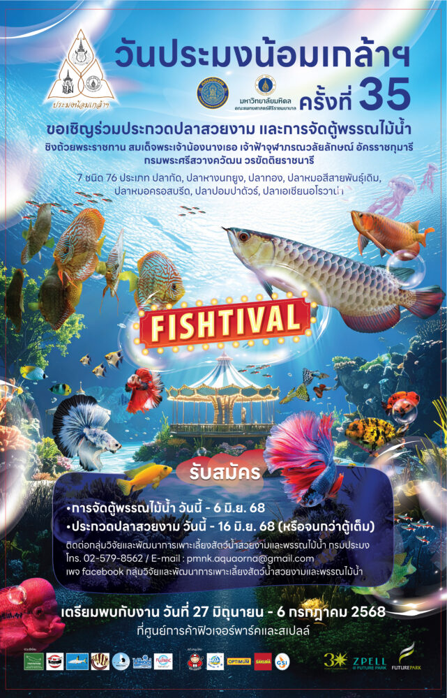 เริ่มแล้ว…การประกวดปลาสวยงามและการจัดตู้พรรณไม้น้ำที่ยิ่งใหญ่และได้มาตรฐานที่สุดในประเทศไทย เปิดเวทีประชันความสวยงามของปลาสวยงาม 7 ชนิด 76 ประเภท พร้อมโชว์ฝีมือการจัดตู้พรรณไม้น้ำหลากหลายชนิด ชิงถ้วยพระราชทาน สมเด็จพระเจ้าน้องนางเธอ เจ้าฟ้าจุฬาภรณวลัยลักษณ์ อัครราชกุมารีฯ ในงานวันประมงน้อมเกล้าฯ ครั้งที่ 35