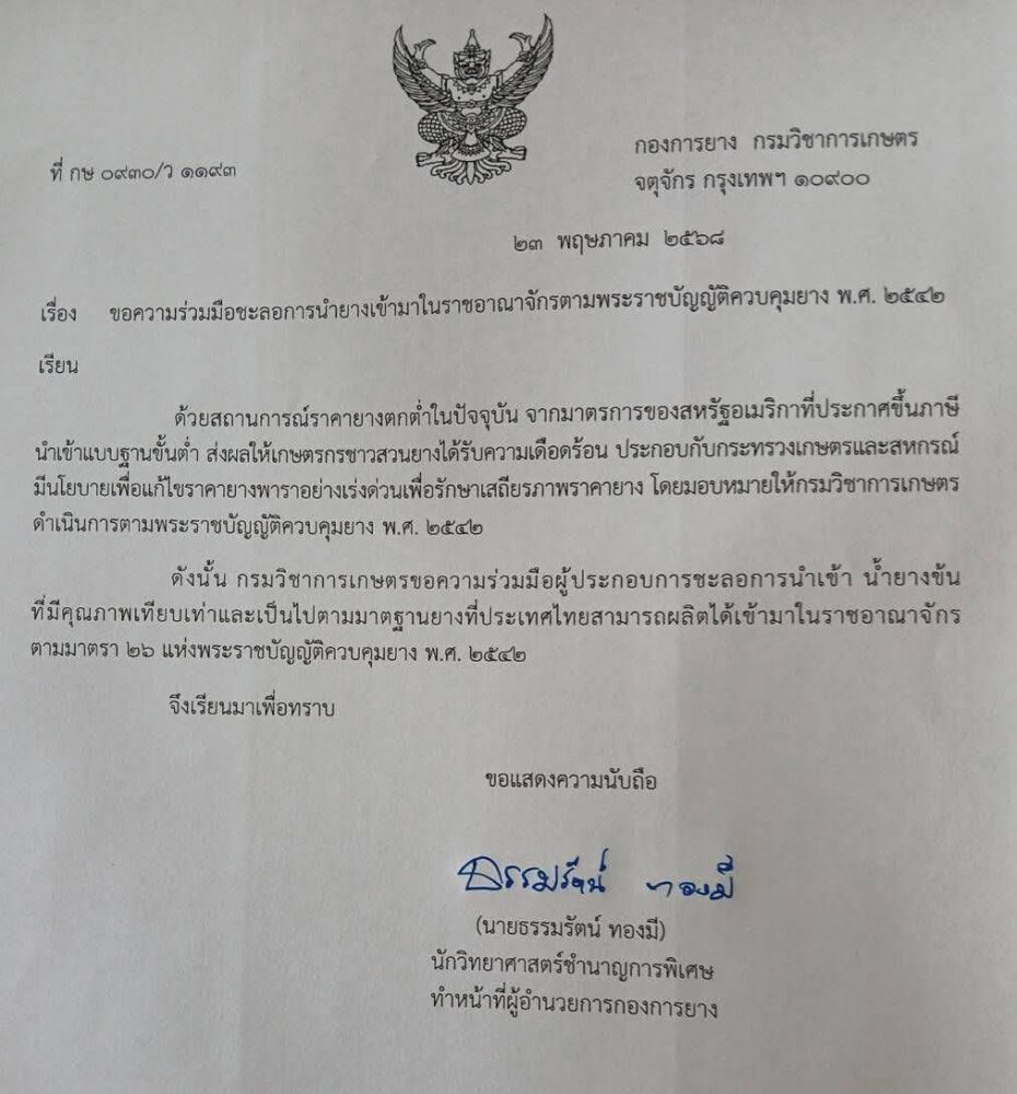 นายธรรมรัตน์ ทองมี ผู้อำนวยการกองการยาง กรมวิชาการเกษตร เปิดเผยถึงกรณีที่สมาคมสมาพันธ์สวนยางแห่งประเทศไทย ได้ส่งจดหมายเปิดผนึกเพื่อสอบถามถึงสาเหตุที่กรมวิชาการเกษตร กระทรวงเกษตรและสหกรณ์ อนุญาตให้นำเข้ายางธรรมชาติ น้ำยางข้นสูตรเฉพาะจากต่างประเทศว่า ทาง ศ.ดร. นฤมล ภิญโญสินวัฒน์ รัฐมนตรีว่าการกระทรวงเกษตรและสหกรณ์ ได้มีคำสั่งให้หน่วยงานที่เกี่ยวข้องประชุมเพื่อตรวจสอบในเรื่องดังกล่าวแล้ว และได้ข้อสรุปว่า สถานการณ์ราคายางตกต่ำเนื่องจากผลกระทบจากมาตรการการเก็บภาษีของสหรัฐอเมริกา กระทรวงเกษตรและสหกรณ์ ได้ดำเนินการตามนโยบายที่จะดำเนินการแก้ไขปัญหาราคายางอย่างต่อเนื่อง โดยการบังคับใช้พระราชบัญญัติควบคุมยาง พ.ศ. 2542 ให้มีประสิทธิภาพ