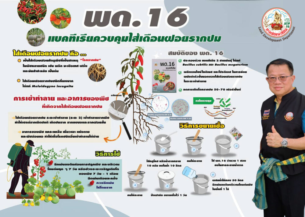 ดร.ทวีศักดิ์ ธนเดโชพล อธิบดีกรมพัฒนาที่ดิน เปิดเผยว่า กรมพัฒนาที่ดินได้ดำเนินการวิจัยคิดค้นนวัตกรรมจุลินทรีย์ควบคุมไส้เดือนฝอยรากปม “พด.16” ช่วยให้เกษตรกรสามารถลดการใช้สารเคมีกำจัดโรคพืช ลดต้นทุนการผลิต และเพิ่มผลผลิตพืช โดยไส้เดือนฝอยรากปม เป็นศัตรูพืชที่ทำความเสียหายกับพืชหลายชนิด เช่น พริก มะเขือเทศ มันฝรั่ง ฝรั่ง มันสำปะหลัง และเมล่อน เป็นต้น ทำให้พืชแสดงอาการแคระแกร็น โตช้า ใบเหลือง เหี่ยว เนื่องจากระบบรากถูกทำลาย ทำให้เกิดปุ่มปมจำนวนมากที่ราก และผลผลิตได้รับความเสียหาย นอกจากนี้ เมื่อไส้เดือนฝอยเข้าทำลายพืชทำให้เกิดแผลบริเวณราก ส่งผลให้เชื้อราสาเหตุโรคอื่น ๆ เข้าทำลายซ้ำเติมได้ จึงทำให้พืชมีโอกาสเกิดโรคอื่น ๆ ตามมา และทำความเสียหายต่อผลผลิตพืช