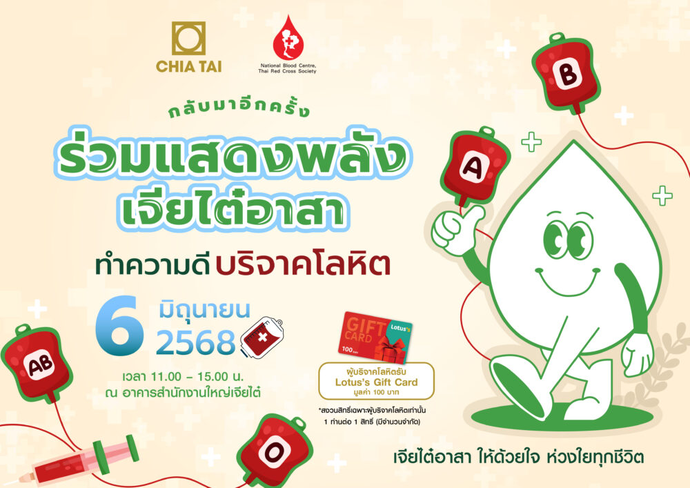 บริษัท เจียไต๋ จำกัด ผู้นำธุรกิจนวัตกรรมการเกษตรของไทย ร่วมกับสภากาชาดไทย เดินหน้าสานต่อกิจกรรมเพื่อสังคมในโครงการ “เจียไต๋อาสา ให้ด้วยใจ ห่วงใยทุกชีวิต” ครั้งที่ 4 ขอเชิญชวนผู้ที่สนใจรวมพลังบริจาคโลหิตช่วยเหลือผู้ป่วยที่กำลังรอความหวังในการรักษา ในวันที่ 6 มิถุนายน 2568 เวลา 11.00 – 15.00 น. ณ อาคารสำนักงานใหญ่ เจียไต๋ สุขุมวิท 60 โดยผู้บริจาคโลหิตจะได้รับบัตรของขวัญโลตัสแทนคำขอบคุณสำหรับการร่วมแบ่งปันความช่วยเหลือ (1 ท่านต่อ 1 สิทธิ์ สงวนสิทธิ์เฉพาะผู้บริจาคโลหิต และของมีจำนวนจำกัด)