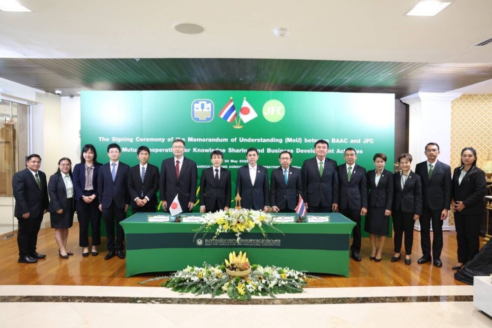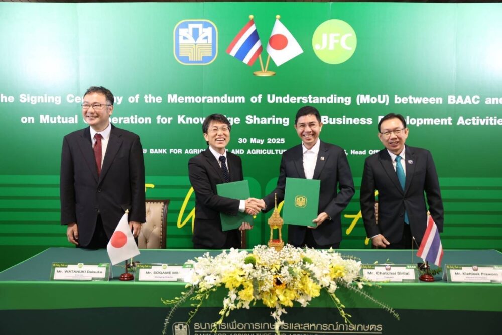 วันที่ 30 พฤษภาคม 2568 นายฉัตรชัย ศิริไล ผู้จัดการ ธนาคารเพื่อการเกษตรและสหกรณ์การเกษตร (ธ.ก.ส.) พร้อมด้วย Mr. Mikio Sogame Managing Director Japan Finance Corporation (JFC) สถาบันการเงินของรัฐบาลญี่ปุ่นที่มีบทบาทหลักในการสนับสนุนภาคเกษตรกรรม ธุรกิจรายย่อย และผู้ประกอบการ SMEs ในประเทศญี่ปุ่น ร่วมลงนามบันทึกความเข้าใจ (Memorandum of Understanding : MoU) ระหว่าง ธ.ก.ส. และ JFC