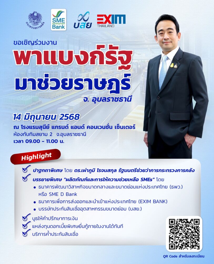 3 สถาบันการเงินของรัฐ ภายใต้กำกับกระทรวงการคลัง ได้แก่ ธนาคารพัฒนาวิสาหกิจขนาดกลางและขนาดย่อมแห่งประเทศไทย (ธพว.) หรือ SME D Bank ธนาคารเพื่อการส่งออกและนำเข้าแห่งประเทศไทย (EXIM BANK) และบรรษัทประกันสินเชื่ออุตสาหกรรมขนาดย่อม (บสย.) จับมือขับเคลื่อนนโยบายรัฐบาล เดินหน้าช่วยกระตุ้นเศรษฐกิจ จัดโครงการ “พาแบงก์รัฐ มาช่วยราษฎร์” นำบริการจาก 3 หน่วยงานมาสนับสนุนผู้ประกอบการเอสเอ็มอี จ.อุบลราชธานี และใกล้เคียง ถึงพื้นที่อย่างครบถ้วนในจุดเดียว ทั้งด้านการเงินและการพัฒนา ในวันที่ 14 มิถุนายน 2568 เวลา 9.00-11.00 น. ณ โรงแรมสุนีย์ แกรนด์ แอนด์ คอนเวนชั่น เซ็นเตอร์ จ.อุบลราชธานี