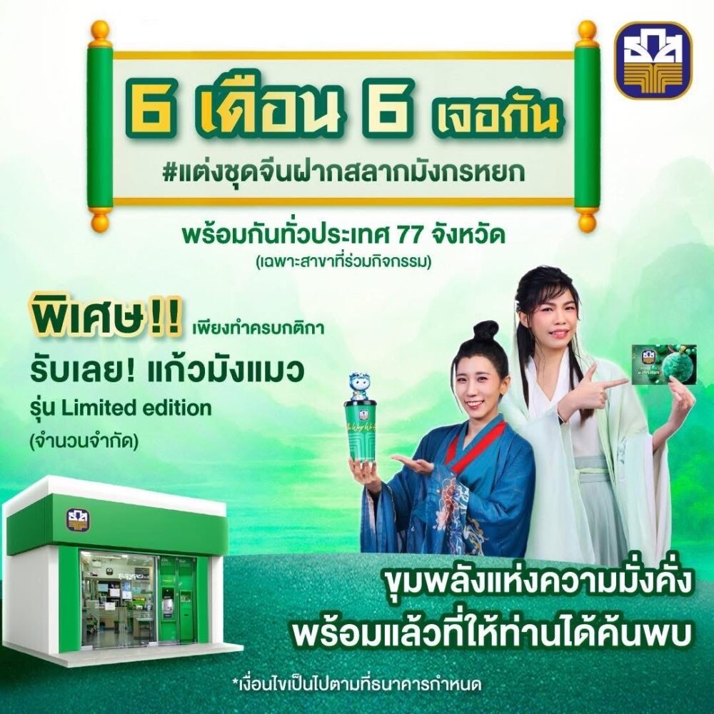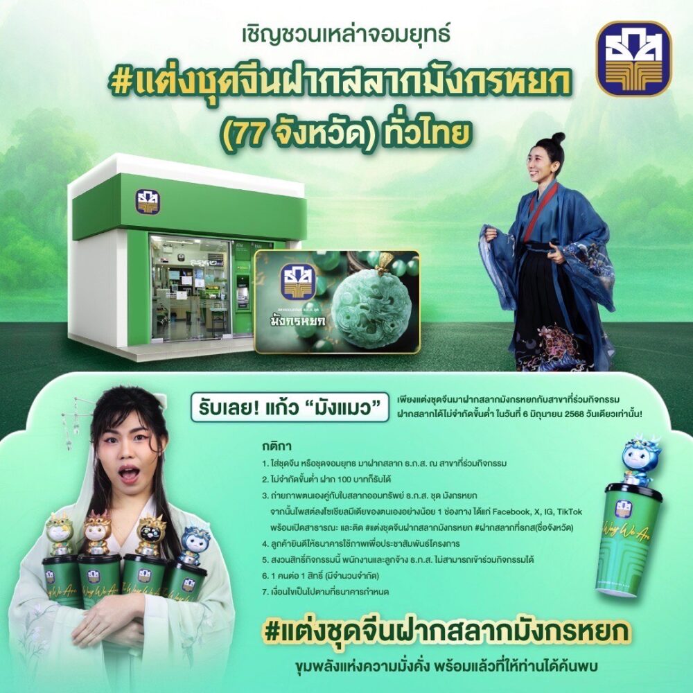 จากนั้นโพสต์ลงโซเชียลมีเดียของผู้ฝาก อย่างน้อย 1 ช่องทาง (Facebook, Tiktok, X และ Instagram) พร้อมติด #แต่งจุดจีนฝากสลากมังกรหยก #ฝากสลากที่ธกส (ตามด้วยชื่อจังหวัดที่ฝาก) รับฟรี “แก้วน้ำมังแมว Limited Edition” กลับบ้านทันที ฝากก่อนได้ก่อน 1 คนต่อ 1 สิทธิ์ (แก้วมังแมวมีจำนวนจำกัด)
