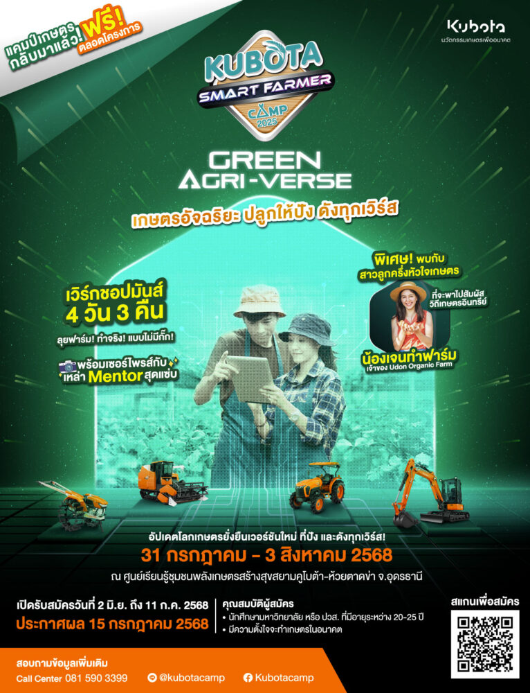 บริษัทสยามคูโบต้าคอร์ปอเรชั่น จำกัด เชิญชวนนักศึกษาที่มีใจรักในการทำเกษตรเข้าร่วม “KUBOTA Smart Farmer Camp 2025” ในธีม “Green Agri-Verse” เกษตรอัจฉริยะ ปลูกให้ปัง ดังทุกเวิร์ส พร้อมจุดประกายเยาวชนรุ่นใหม่ที่มีใจรักการเกษตร ให้ได้อัปเดตโลกการเกษตรยั่งยืน ผ่านกิจกรรมเชิงปฏิบัติสุดเข้มข้นกับที่สุดของแคมป์เกษตรสุดมันส์แห่งปี