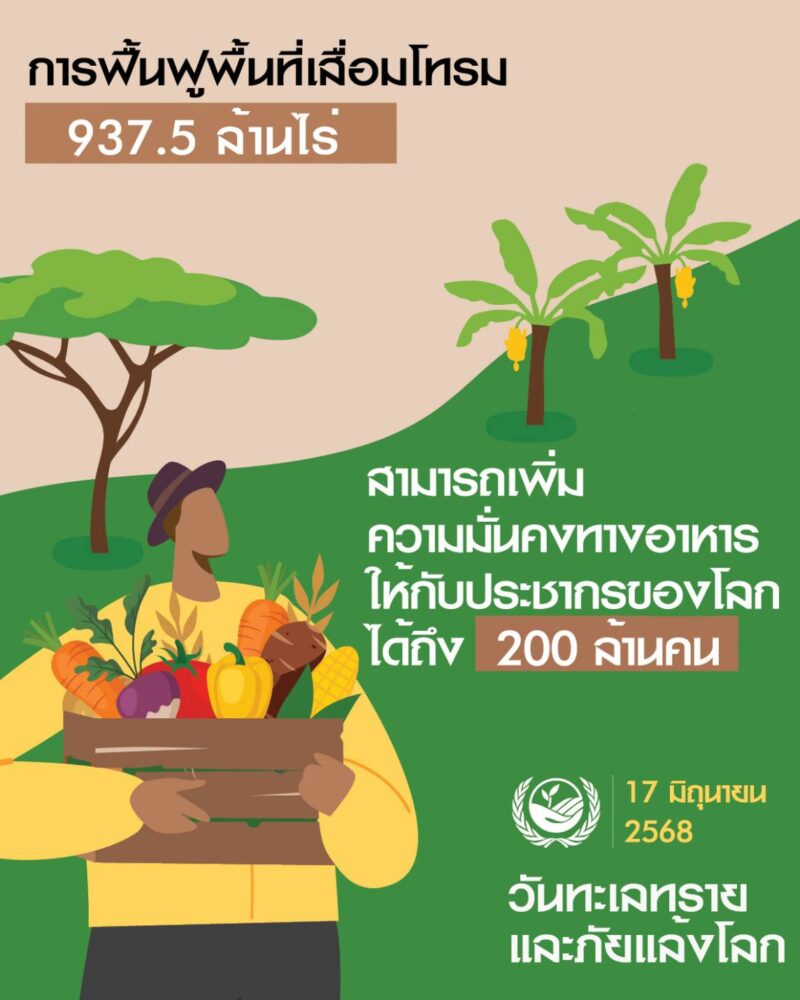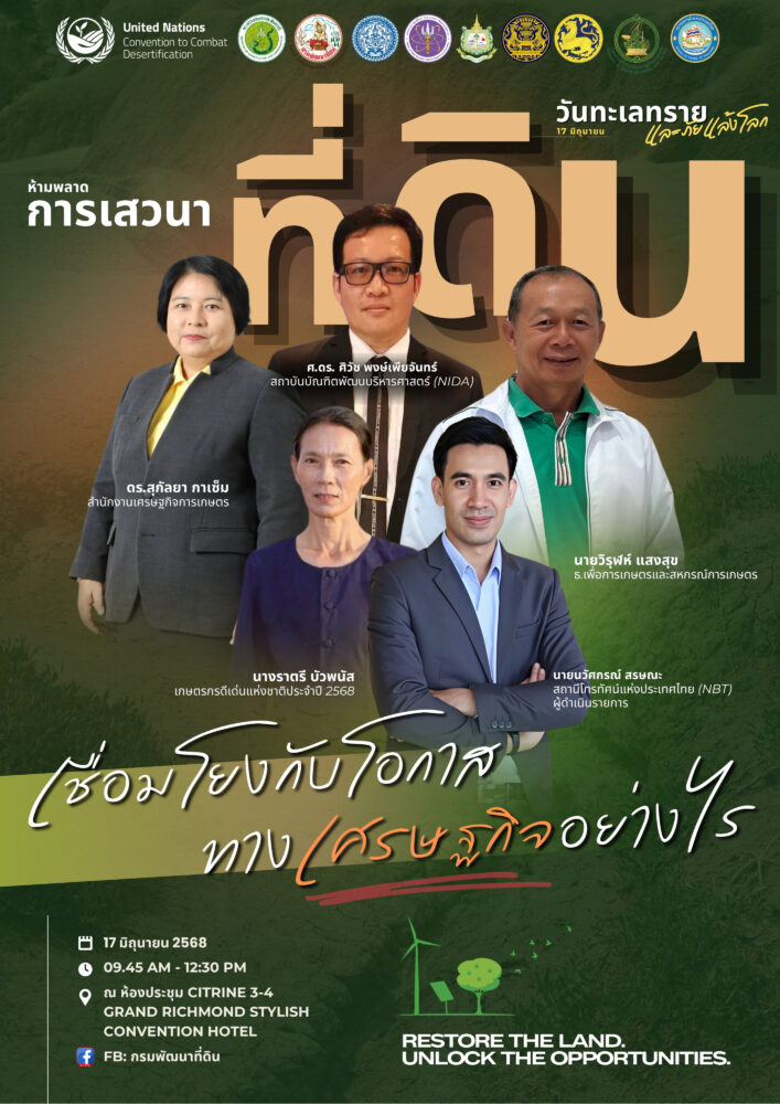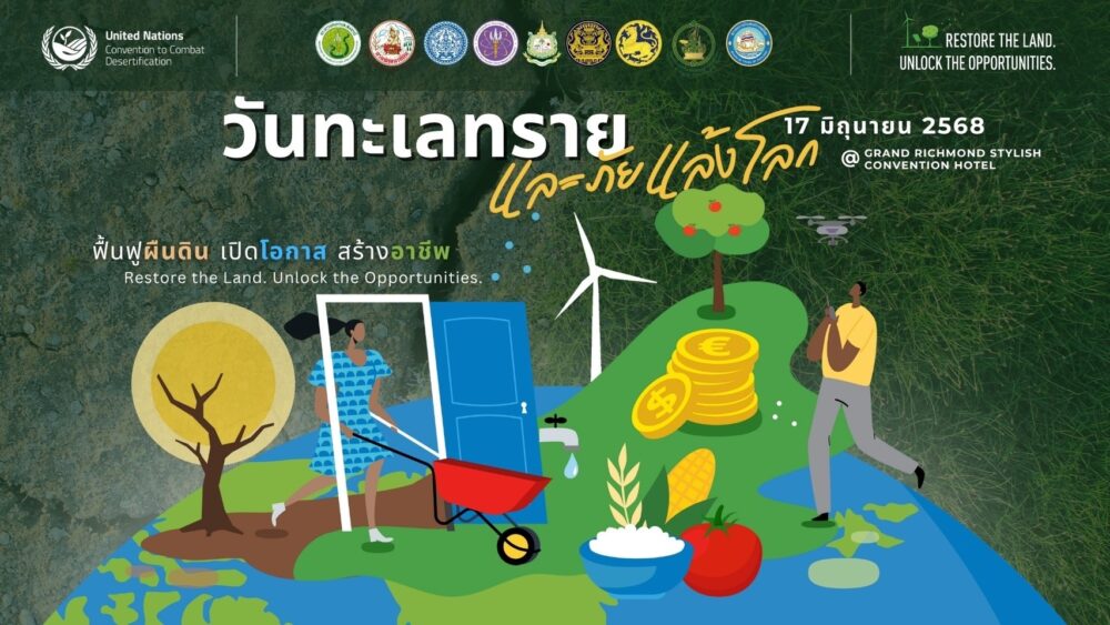 “17 มิถุนายน วันทะเลทรายและภัยแล้งโลก” ปีนี้กรมพัฒนาที่ดิน ชูแนวคิด “Restore the Land. Unlock the Opportunities.: ฟื้นฟูผืนดิน เปิดโอกาส สร้างอาชีพ” พร้อมกิจกรรมการเสวนาวิชาการในหัวข้อ “ที่ดินเชื่อมโยงกับโอกาสทางเศรษฐกิจอย่างไร” ซึ่งจะเปิดเวทีแลกเปลี่ยนแนวคิดจากผู้เชี่ยวชาญด้านการฟื้นฟูที่ดินและเศรษฐกิจฐานราก รวมทั้ง นิทรรศการทุกภาคส่วน มากกว่า 10 หน่วยงาน และภาคีเครือข่าย 8 กระทรวง 33 หน่วยงาน เข้าร่วมแลกเปลี่ยนประสบการณ์วนงานนี้