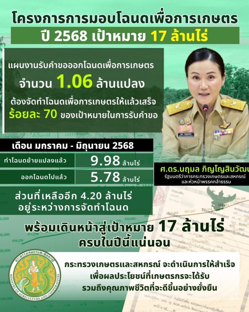 “นฤมล” โชว์ตัวเลขมอบโฉนดเพื่อเกษตรครึ่งปี 68 แจกแล้ว 5.78 ล้านไร่ เดินหน้าเต็มสูบเพื่อเกษตรกร มั่นใจ ปีนี้ครบ 17 ล้านไร่ ตามเป้า ปรับจากแผนเป้าหมายเดิมใน 22 ล้านไร่