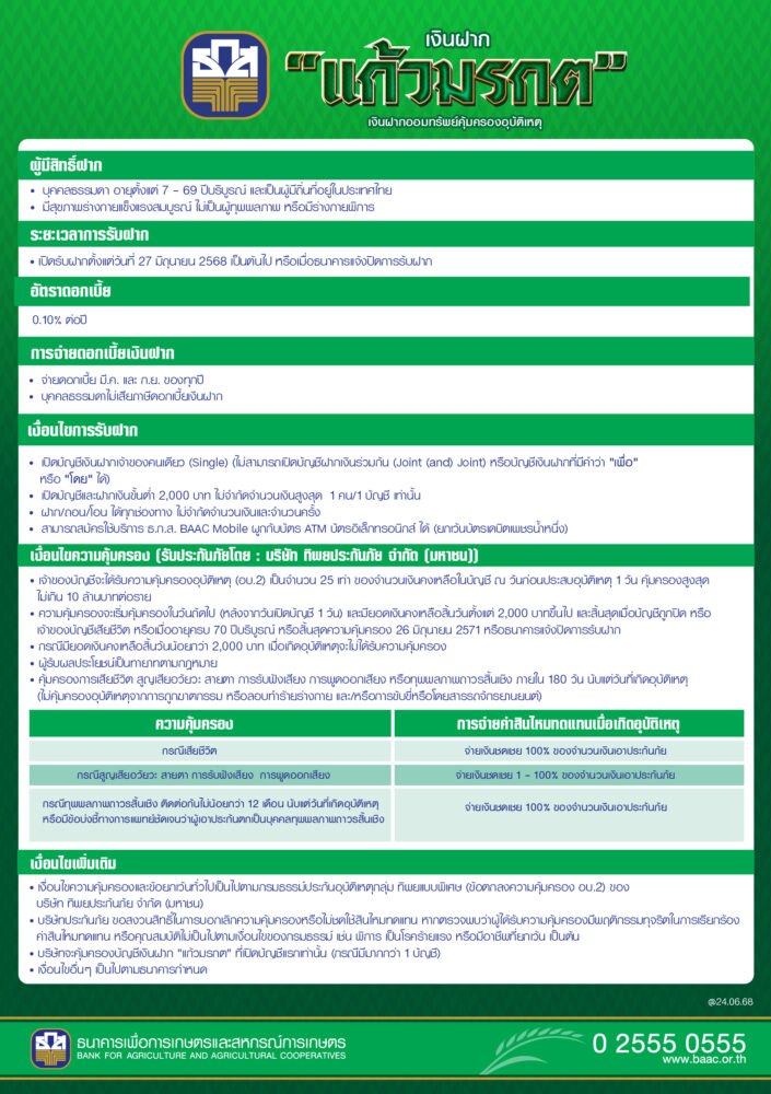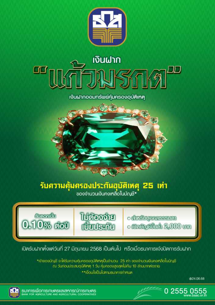 นายไพศาล หงษ์ทอง รองผู้จัดการ ธนาคารเพื่อการเกษตรและสหกรณ์การเกษตร (ธ.ก.ส.) เปิดเผยว่า เพื่อเป็นการเสริมสร้างพฤติกรรมการออมเงินระยะยาวอย่างต่อเนื่องและร่วมสร้างภูมิคุ้มกันทางการเงินให้กับคนไทยอย่างยั่งยืน ธ.ก.ส. เปิดตัวผลิตภัณฑ์เงินฝากแก้วมรกต ออมง่ายแถมได้รับความคุ้มครอง เปิดบัญชีและฝากเงินเริ่มต้นเพียง 2,000 บาทขึ้นไป โดยไม่จำกัดวงเงินฝากสูงสุด (1 คนต่อบัญชี) รับผลตอบแทนเป็นดอกเบี้ยเงินฝากในอัตราร้อยละ 0.10 ต่อปี โดยจ่ายดอกเบี้ยทุกเดือนมีนาคมและกันยายน พร้อมรับสิทธิประโยชน์ความคุ้มครองประกันอุบัติเหตุ (อบ.2)