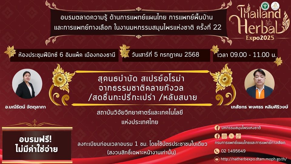 วว. นำเสนอผลงานวิจัยนวัตกรรมเพิ่มมูลค่าผลิตภัณฑ์สมุนไพร ภายใต้แนวคิด “ภูมิปัญญาไทย ซอฟต์พาวเวอร์ไทย สร้างเศรษฐกิจไทย” พร้อมอบรมฟรีหลักสูตร “สุคนธบำบัด สเปรย์อโรม่า จากธรรมชาติคลายกังวล/สดชื่นกะปรี่กะเปร่า/หลับสบาย” ในงานมหกรรมสมุนไพรแห่งชาติ