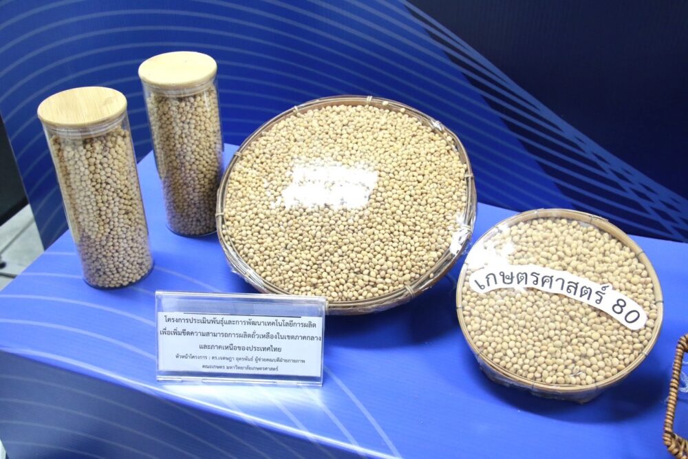 -ถั่วเหลืองเกษตรศาสตร์ 80 – สายพันธุ์ใหม่โปรตีนสูง “ปลอดจีเอ็มโอ” รับมือวิกฤตนำเข้า ปรับตัวได้ดีในพื้นที่ ภาคกลางและภาคเหนือตอนล่าง ให้ผลผลิตเฉลี่ย 350 กก./ไร่ สูงกว่าวิธีเดิมถึง 16% ปัจจุบันมีการขยายผลในพื้นที่ 4 จังหวัด รวมกว่า 1,000 ไร่