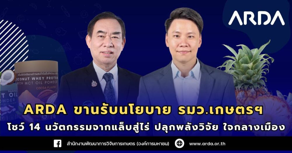 ARDA เปิด 14 นวัตกรรมวิจัยจากแล็บสู่ไร่ ตอบโจทย์เกษตรมูลค่าสูง สู่ความยั่งยืน ใช้ได้จริง…ภายใต้กิจกรรม “ARDA Mini Press @ KU” พร้อมขานรับนโยบายกระทรวงเกษตรและสหกรณ์ ที่ให้ความสำคัญกับ “เกษตรอัจฉริยะ–เกษตรเพิ่มมูลค่า–เกษตรยั่งยืน” โดยเน้นการลดต้นทุน เพิ่มรายได้ ผ่านการใช้งานวิจัยและนวัตกรรมจริงในภาคเกษตรพร้อมประกาศความร่วมมือกับภาควิชาการในการเร่งยกระดับผลผลิตเกษตรปลอดภัย สร้างมูลค่าเพิ่ม รองรับพฤติกรรมผู้บริโภคยุคใหม่ภายใต้แนวทาง BCG Economy ณ มหาวิทยาลัยเกษตรศาสตร์