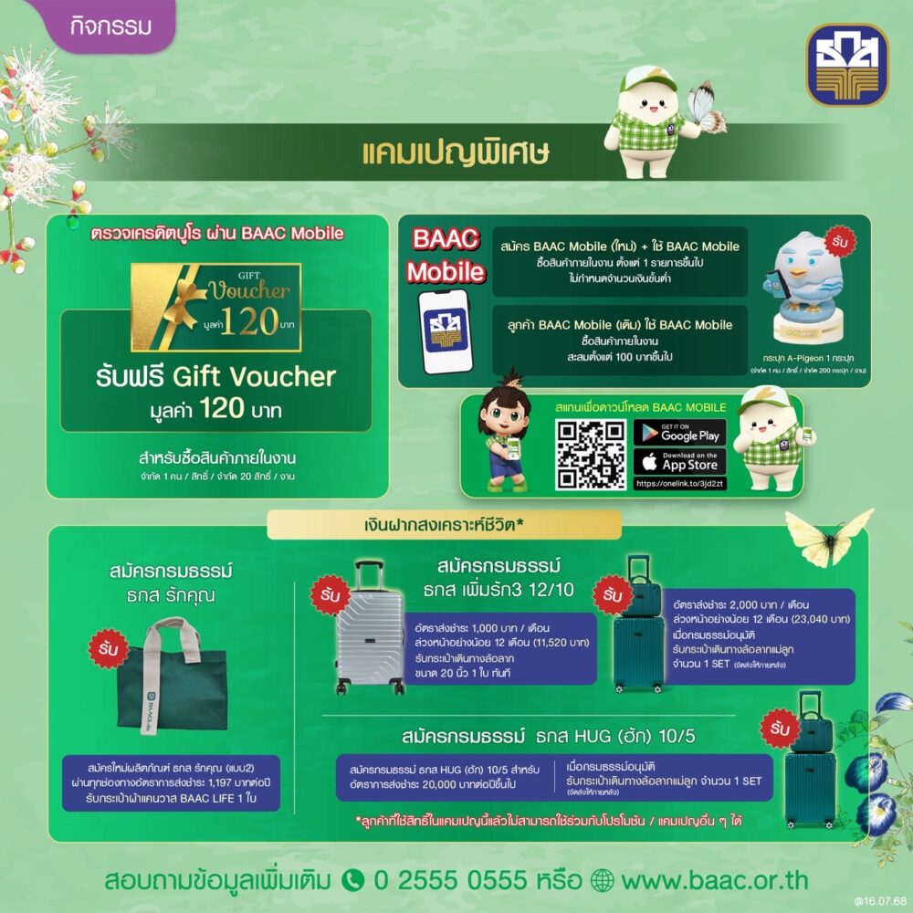 นายไพศาล กล่าวอีกว่า ยังมีผลิตภัณฑ์เงินฝากสงเคราะห์ชีวิต ซึ่งถือเป็นทางเลือกในการออมเงินที่มาพร้อมความคุ้มครองและสิทธิประโยชน์ในการลดหย่อนภาษี ที่คัดโปรโมชันพิเศษมานำเสนอ เพื่อรับของสมนาคุณ ทั้งกระเป๋าเดินทาง กระเป๋าเดินทางแม่ลูก จำนวน 1 เซต (ประกอบด้วย 2 ใบ คือ กระเป๋าเดินทาง 4 ล้อลาก ขนาด 20 นิ้ว และกระเป๋าเดินทางแบบหิ้ว ขนาด 14 นิ้ว) และรับกระเป๋าผ้าแคนวาส BAAC Life เป็นต้น