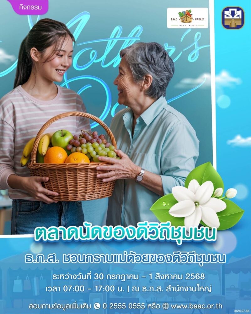 ธ.ก.ส. ต้อนรับเทศกาลวันแม่ 2568 จัดงานตลาดนัดของดีวิถีชุมชน ภายใต้ธีม“ของฝากกราบคุณแม่”ยกสินค้าเกษตรและผลิตภัณฑ์ชุมชนเกรดพรีเมียมและของฝากคุณภาพดีเต็มเปี่ยมด้วยความรัก ความตั้งใจและเอกลักษณ์ของแต่ละที่ชุมชนจากฝีมือเกษตรกรลูกค้า ธ.ก.ส. ทั่วประเทศกว่า 50 ร้านค้า ที่รวมไว้ที่งานครั้งนี้ ระหว่างวันที่ 30 กรกฎาคม – 1 สิงหาคมนี้ ณ บริเวณด้านหน้า ธ.ก.ส. สำนักงานใหญ่ กรุงเทพฯ เดินทางสะดวกติดกับสถานีรถไฟฟ้าบีทีเอสสถานีมหาวิทยาลัยเกษตรศาสตร์