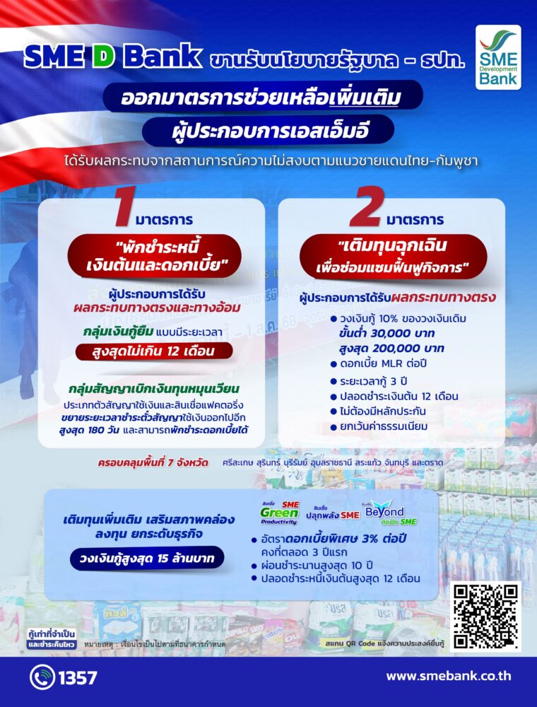 SME D Bank ห่วงใยประชาชน และเอสเอ็มอีได้รับผลกระทบจากเหตุความไม่สงบตามแนวชายแดนไทย-กัมพูชา ออกมาตรการช่วยเหลือเพิ่มเติม สอดคล้องนโยบายรัฐบาล โดยกระทรวงการคลัง และ ธปท. ได้แก่ พักชำระหนี้เงินต้นและดอกเบี้ย สูงสุด 12 เดือน ควบคู่เติมทุนฉุกเฉิน เพื่อซ่อมแซมฟื้นฟูกิจการ ครอบคลุมพื้นที่ 7 จังหวัด ประกอบด้วย ศรีสะเกษ สุรินทร์ บุรีรัมย์ อุบลราชธานี สระแก้ว จันทบุรี และตราด นอกจากนั้น เปิดสายด่วน 1357 รับแจ้งขอความช่วยเหลือทันท่วงที พร้อมเปิดรับบริจาคสิ่งของนำไปมอบให้แก่ผู้ประสบภัยและทหารหาญ