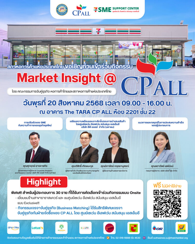 สภาหอการค้าแห่งประเทศไทย ร่วมกับ บริษัท ซีพี ออลล์ จำกัด (มหาชน) ผู้บริหารเซเว่น อีเลฟเว่น และเซเว่น เดลิเวอรี่ ชวนผู้ประกอบการ SME เข้าร่วมงาน “Market Insight @ CP ALL” เวทีสร้างโอกาสสำคัญเพื่อเรียนรู้และเตรียมความพร้อมในการขยายตลาดสู่ช่องทางร้านเซเว่น อีเลฟเว่น ในวันที่ 20 สิงหาคม 2568 เวลา 09.00 – 16.00 น. ณ ห้อง 2201 ชั้น 22 อาคาร The TARA (ถ.แจ้งวัฒนะ)