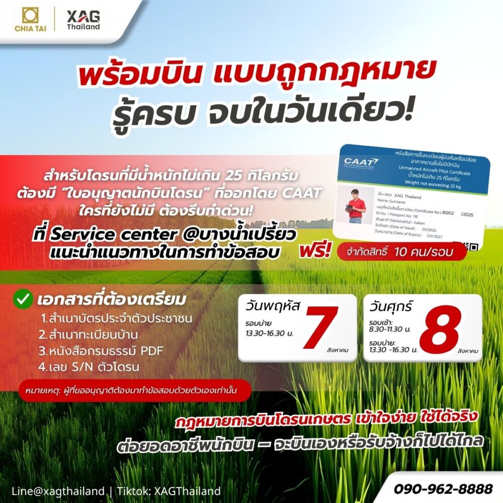XAG Thailand ในกลุ่มบริษัท เจียไต๋ จำกัด ผู้นำธุรกิจนวัตกรรมการเกษตรของไทย จัดอบรมพิเศษสำหรับนักบินโดรนเกษตรทุกแบรนด์ ระหว่างวันที่ 7–8 สิงหาคม 2568 โดยไม่เสียค่าใช้จ่าย เพื่อเสริมสร้างความเข้าใจเกี่ยวกับแนวทางปฏิบัติตามกฎหมายใหม่ว่าด้วยการบินโดรนในภาคเกษตร