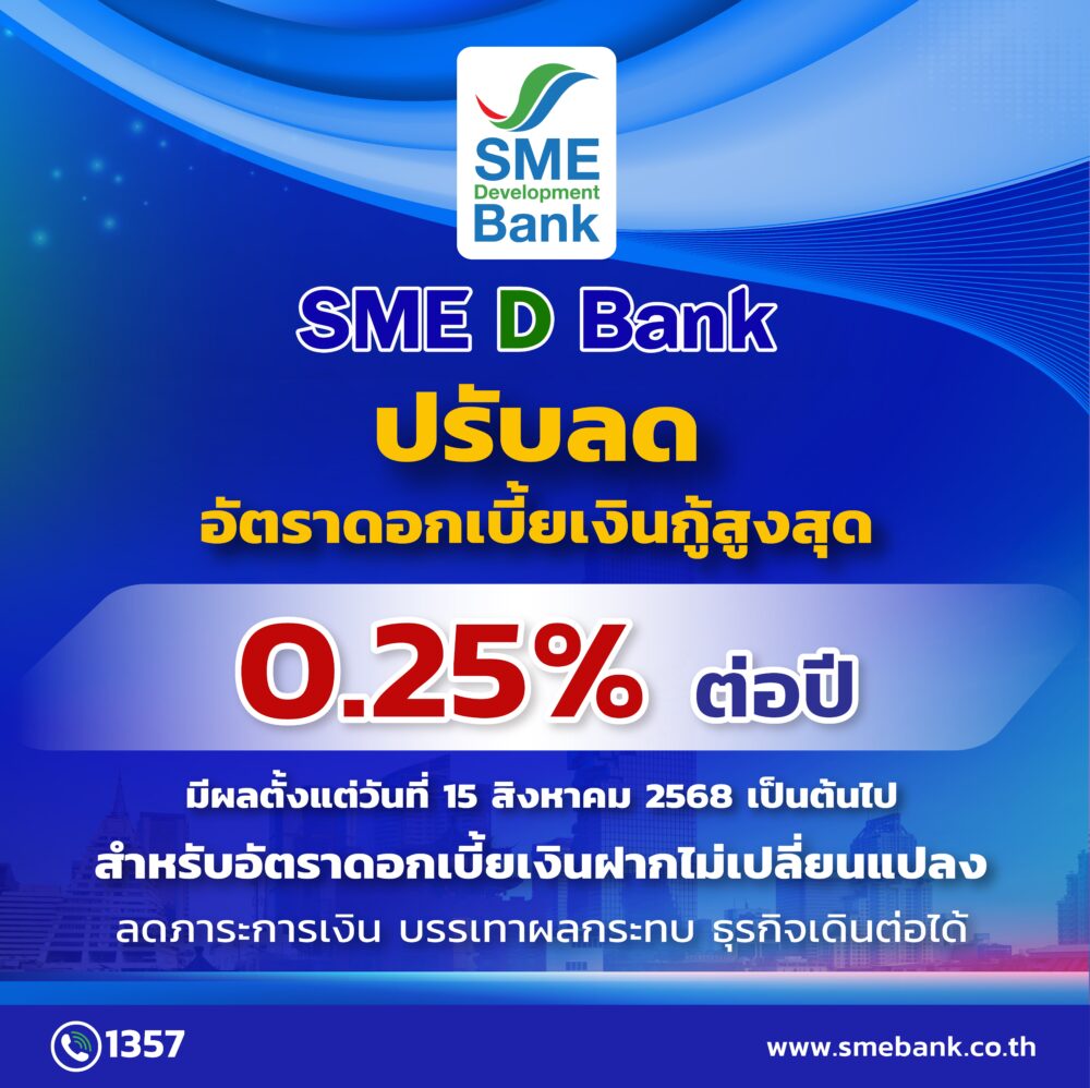 SME D Bank ชูจุดยืนอยู่เคียงข้างเอสเอ็มอีไทย ล่าสุดประกาศลดอัตราดอกเบี้ยเงินกู้ทุกประเภทสูงสุด 0.25% เพื่อบรรเทาภาระต้นทุนทางการเงินให้แก่ผู้ประกอบการให้ยืนหยัดได้ในทุกสถานการณ์ ขณะที่อัตราดอกเบี้ยเงินฝากยังคงตรึงไว้เช่นเดิม