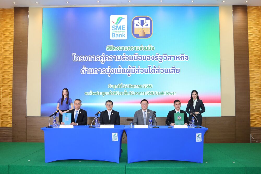 ธนาคารพัฒนาวิสาหกิจขนาดกลางและขนาดย่อมแห่งประเทศไทย (ธพว.) หรือ SME D Bank โดย นายพิชิต มิทราวงศ์ กรรมการผู้จัดการ และ ธนาคารเพื่อการเกษตรและสหกรณ์การเกษตร (ธ.ก.ส.) โดย นายฉัตรชัย ศิริไล ผู้จัดการ ร่วมลงนามบันทึกความเข้าใจเพื่อความร่วมมือทางธุรกิจ (MOU) หน่วยงานรัฐกับหน่วยงานรัฐ (G To G) ภายใต้ “โครงการคู่ความร่วมมือของรัฐวิสาหกิจ ด้านการมุ่งเน้นผู้มีส่วนได้ส่วนเสีย” เพื่อยกระดับและพัฒนาผลการดำเนินงานหน่วยงานรัฐวิสาหกิจ ตามแนวทางของสำนักงานคณะกรรมการนโยบายรัฐวิสาหกิจ (สคร.) โดยพิธีลงนามจัดขึ้นเมื่อวันที่ 22 สิงหาคม 2568 ณ ห้องประชุมแก้ววิเชียร ชั้น 11 อาคาร SME Bank Tower