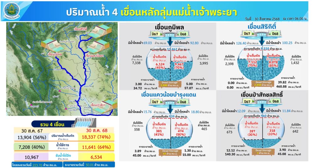 วันที่ 30 สิงหาคม 2568 ศูนย์ปฏิบัติการน้ำอัจฉริยะ (SWOC) กรมชลประทาน รายงานถึงสถานการณ์น้ำในอ่างเก็บน้ำขนาดใหญ่และขนาดกลางทั่วประเทศ ว่า มีปริมาณน้ำรวม 52,541 ล้าน ลบ.ม. (คิดเป็น 69% ของความจุอ่างฯ รวมกัน) สามารถรับน้ำได้อีก 23,964 ล้าน ลบ.ม. เฉพาะลุ่มน้ำเจ้าพระยา 4 เขื่อนหลัก (เขื่อนภูมิพล เขื่อนสิริกิติ์ เขื่อนแควน้อยบำรุงแดน และเขื่อนป่าสักชลสิทธิ์) มีปริมาณน้ำรวมกัน 18,337 ล้าน ลบ.ม. (74% ของความจุอ่างฯ รวมกัน) สามารถรับน้ำได้อีก 6,534 ล้าน ลบ.ม.
