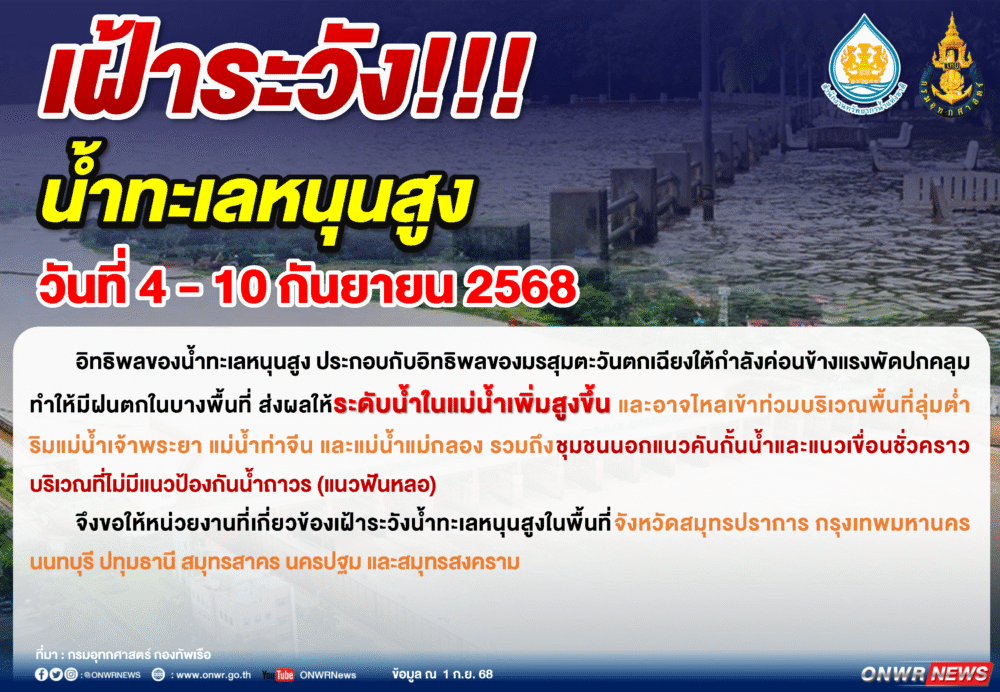 ด้วยสำนักงานทรัพยากรน้ำแห่งชาติ (สทนช.) ได้ติดตามสถานการณ์น้ำทะเลหนุนสูงบริเวณแม่น้ำเจ้าพระยาจากกรมอุทกศาสตร์ โดยคาดหมายระดับน้ำบริเวณป้อมพระจุลจอมเกล้า และพื้นที่ใกล้เคียงในระหว่างวันที่ 4 – 10 กันยายน 2568 เวลาประมาณ 17.00 – 20.00 น. เป็นช่วงที่ระดับน้ำทะเลหนุนสูง โดยคาดหมายระดับน้ำบริเวณป้อมพระจุลจอมเกล้า และพื้นที่ใกล้เคียงอาจมีความสูงประมาณ 1.70 – 2.00 เมตร จากระดับทะเลปานกลาง ซึ่งสูงกว่าระดับน้ำวิกฤติประมาณ 0.30 เมตร ประกอบกับอิทธิพลของมรสุมตะวันตกเฉียงใต้กำลังค่อนข้างแรงพัดปกคลุม ทำให้มีฝนตกในบางพื้นที่ ส่งผลให้ระดับน้ำในแม่น้ำจะเพิ่มสูงขึ้น เกิดน้ำเอ่อล้นเข้าท่วม