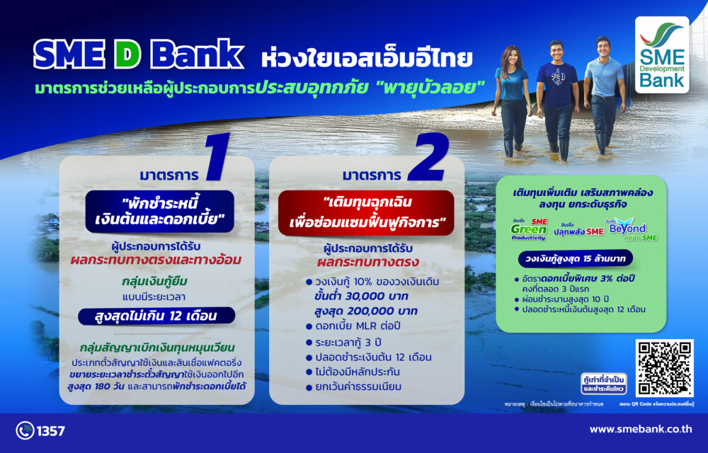 SME D Bank ออกมาตรการเร่งด่วน ช่วยเหลือผู้ประกอบการเอสเอ็มอี ได้รับผลกระทบจากอิทธิพลพายุ “บัวลอย”ในพื้นที่18 จังหวัด ตามรายงานกรมป้องกั นและบรรเทาสาธารณภัยให้สิทธิ์พั กชำระหนี้เงินต้นและดอกเบี้ยสู งสุดไม่เกิน 12 เดือนช่วยลดภาระทางการเงิน ควบคู่เติมทุนฉุกเฉิน ซ่อมแซมฟื้นฟูให้กิจการกลั บมาเดินหน้าได้โดยเร็ว