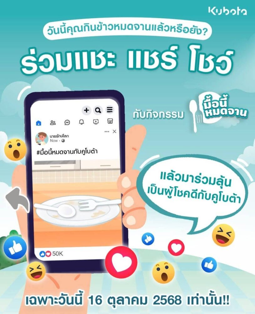 บริษัทสยามคูโบต้าคอร์ปอเรชั่น จำกัด จัดกิจกรรมเชิญชวน วันนี้ใคร “กินข้าวหมดจาน” แล้วบ้าง มาแชร์กันหน่อย กับกิจกรรม “มื้อนี้หมดจานกับคูโบต้า” เพียงแค่กินข้าวหมดจาน ก็มีสิทธิ์ลุ้นรับของรางวัลสุดว้าวไปเลย!