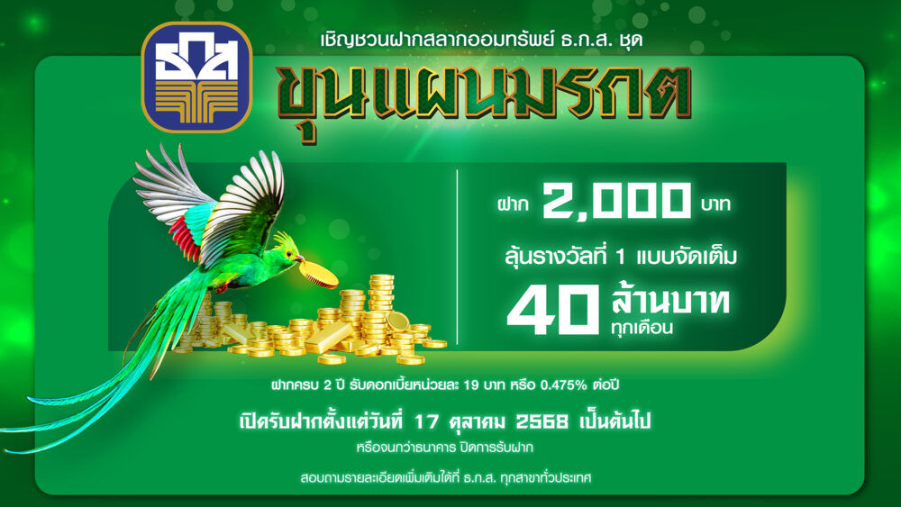 สลากออมทรัพย์ ธ.ก.ส. ชุด ขุนแผนมรกต ฝาก 2,000 บาท ครบ 2 ปี รับดอกเบี้ยหน่วยละ 19 บาท ลุ้นรวย 40 ล้านบาท เริ่มแล้ว 17 ตุลาคม 2568 เพียงแต่อายุ 7 ปีบริบูรณ์ ที่มีถิ่นที่อยู่ในประเทศไทยก็ฝากได้แล้ว