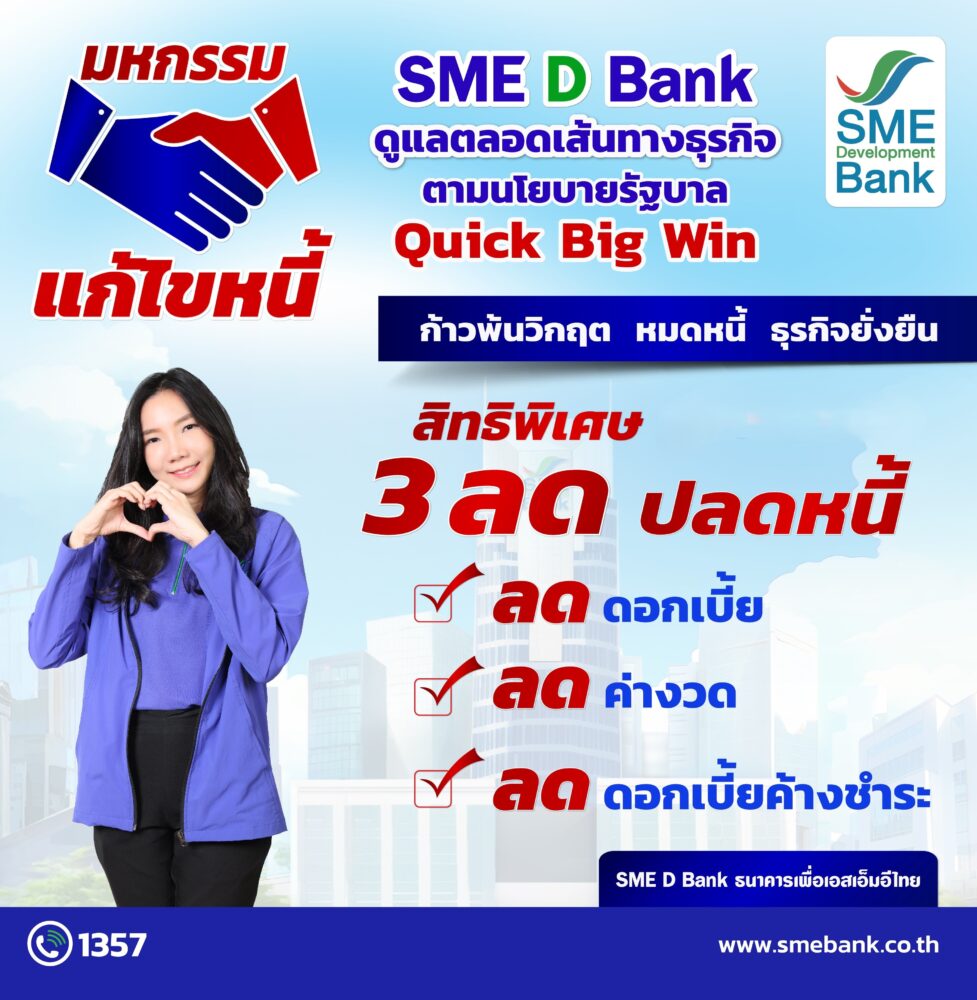 SME D Bank เดินหน้านโยบายรัฐ จัดมหกรรมแก้ไขหนี้อย่างยั่งยืน ชู “3 ลด” ช่วยผู้ประกอบการก้าวพ้นวิกฤต สร้างโอกาสเริ่มต้นใหม่ได้อีกครั้ง