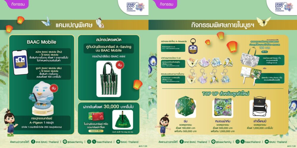 ธ.ก.ส. ขนโปรโมชันเงินฝากและบริการทางการเงินเสิร์ฟพี่น้องภาคเหนือในงาน Money Expo Chiang Mai ทั้งผลิตภัณฑ์เงินฝาก – เงินฝากทองชมพูนุช ฝากเงินขั้นต่ำ 100,000 บาท รวมสูงสุดไม่เกิน 100 ล้านบาทต่อราย จ่ายดอกเบี้ยเงินฝากล่วงหน้า ณ วันที่ฝากเงิน ร้อยละ 1.40 ต่อปี