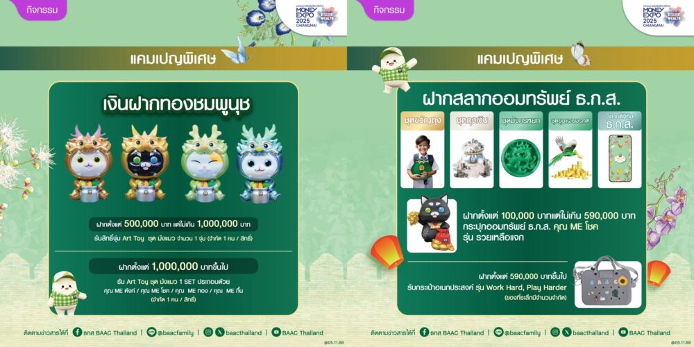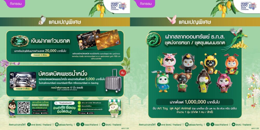 เปิดรับฝากแล้วตั้งแต่วันนี้จนถึงวันที่ 4 ธันวาคม 2568 พิเศษ เมื่อฝากตั้งแต่ 500,000 บาท แต่ไม่เกิน 1,000,000 บาท รับสิทธิ์จุ่ม Art Toy ชุดมังแมว จำนวน 1 จุ่ม (จำกัด 1 คนต่อสิทธิ์) และเมื่อฝากตั้งแต่ 1,000,000 บาทขึ้นไป รับ Art Toy ชุดมังแมว ครบเซต 4 ตัว (จำกัด 1 คน/สิทธิ์) เงินฝากแก้วมรกต ฝากเริ่มต้นเพียง 2,000 บาท รับผลตอบแทนเป็นดอกเบี้ยเงินฝาก แถมสิทธิประโยชน์ความคุ้มครองอุบัติเหตุสูงสุดถึง 25 เท่าของยอดเงินฝากคงเหลือ วงเงินคุ้มครองสูงสุดไม่เกิน 10 ล้านบาท เมื่อฝากตั้งแต่ 20,000 บาทขึ้นไป และคงยอดไว้ 3 เดือน พร้อมสมัครบัตรเดบิตแบบมีประกัน(พลอยไพฑูรย์ หรือบุษย์น้ำทอง) รับเพิ่มสลากออมทรัพย์ ธ.ก.ส. ชุดมังกรหยก มูลค่า 100 บาท และด้านสลากออมทรัพย์