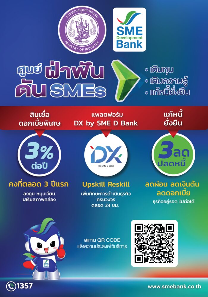 SME D Bank ขับเคลื่อนนโยบาย “ฝ่า ฟัน ดึง ดัน” ของกระทรวงอุตสาหกรรม ผนึกกำลังหน่วยงานพันธมิตรภาครัฐและเอกชน เปิด “ศูนย์ฝ่าฟัน ดัน SMEs” ปูพรม 96 แห่งทั่วประเทศ ให้บริการ “3 เติม” ได้แก่ เติมทุน-เติมความรู้- เติมโอกาสแก้หนี้อย่างยั่งยืน ช่วยผู้ประกอบการเอสเอ็มอีไทย อยู่รอด ก้าวข้ามวิกฤต และเดินหน้าสู่การเติบโตอย่างเข้มแข็งและยั่งยืน
