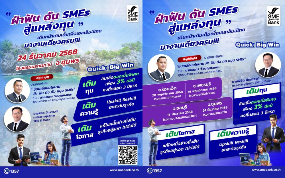 กำหนดจัด 4 ครั้ง ใน 4 จังหวัด ได้แก่ วันที่ 20 พ.ย.68 ณ โรงแรมเดอะโฮเพลส จ.ร้อยเอ็ด , วันที่ 29 พ.ย.68 ณ โรงแรมรอยัลไดมอน จ.เพชรบุรี , วันที่ 11 ธ.ค.68 ณ โรงแรมบางแสนเฮอริเทจ จ.ชลบุรี และวันที่ 24 ธ.ค.68 ณ โรงแรมมรกตทวิน จ.ชุมพร พร้อมรับฟังปาฐกถาพิเศษ “ขับเคลื่อนนโยบาย ฝ่า ฟัน ดึง ดัน หนุน SMEs” โดย นายธนกร วังบุญคงชนะ รัฐมนตรีว่าการกระทรวงอุตสาหกรรม